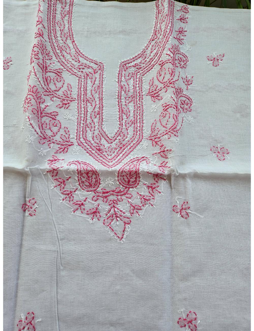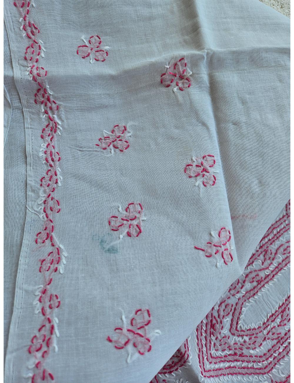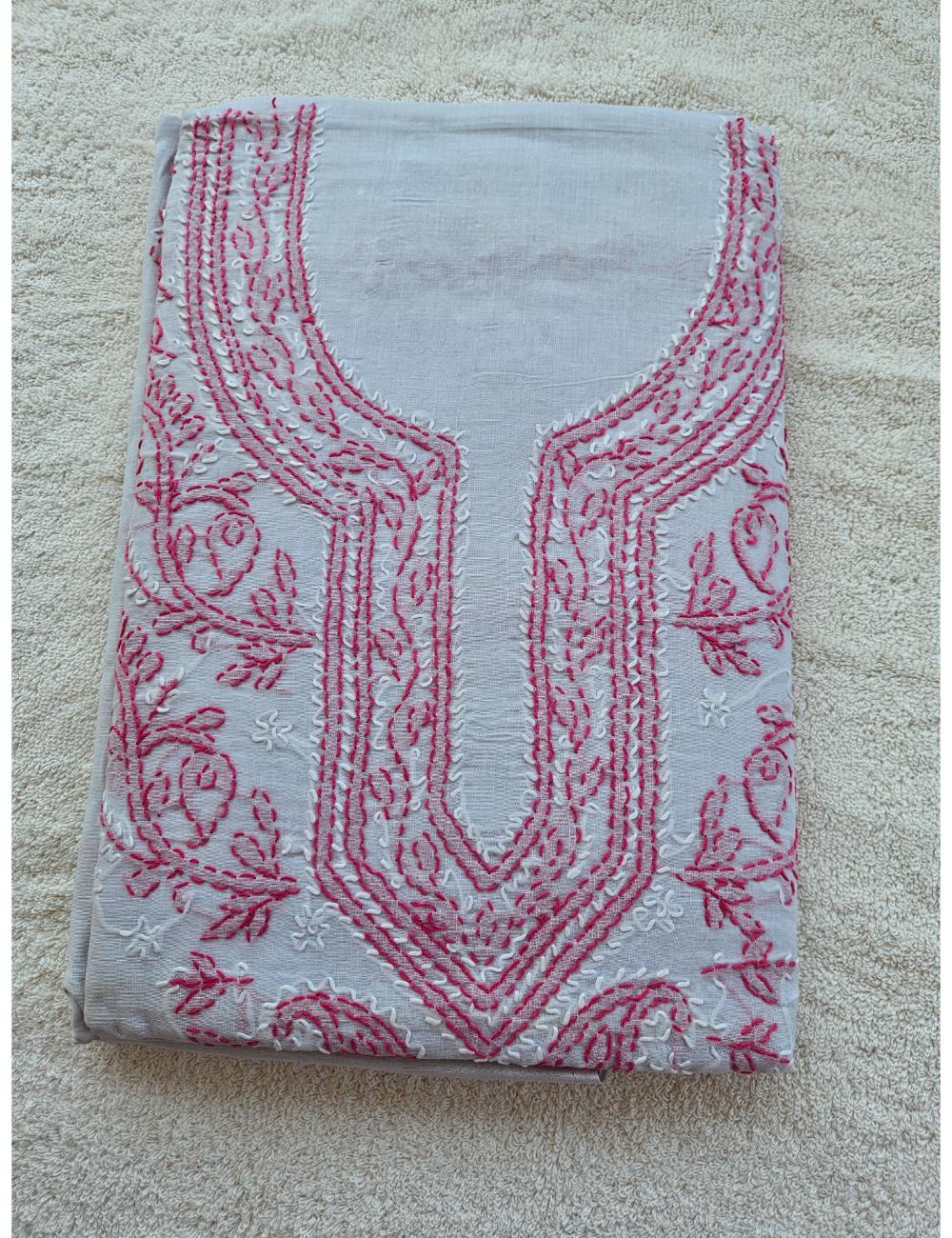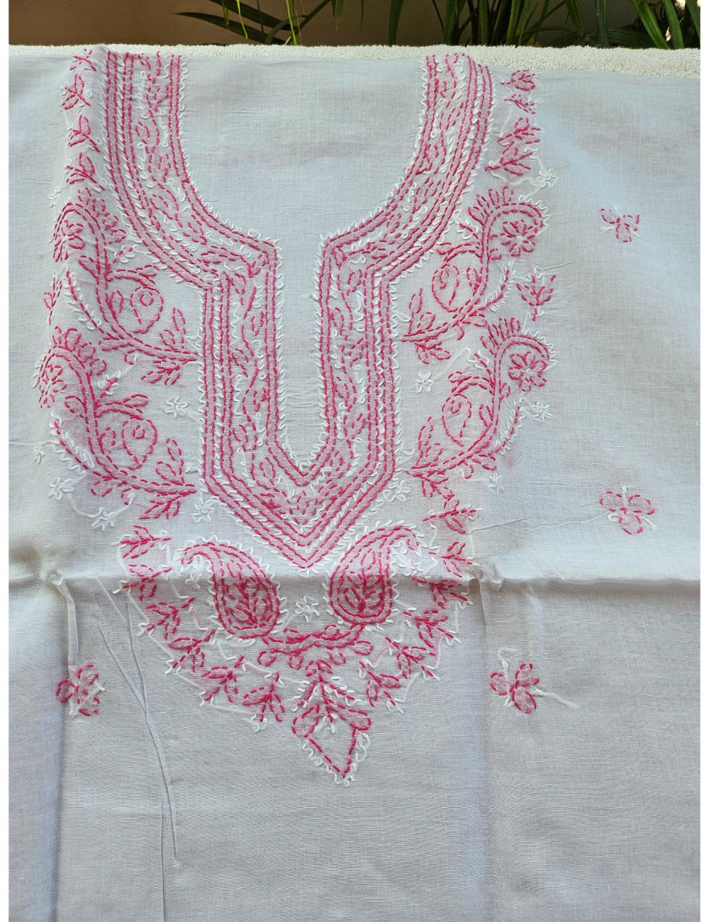 Drape yourself in elegance with this 3pc white and pink Lucknow chikankari dress material, featuring intricate hand embroidery on pure cotton. The set includes a beautifully embroidered kurta, salwar and a matching dupatta fabric.