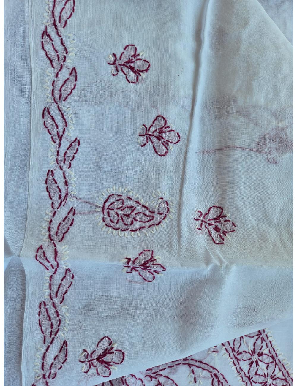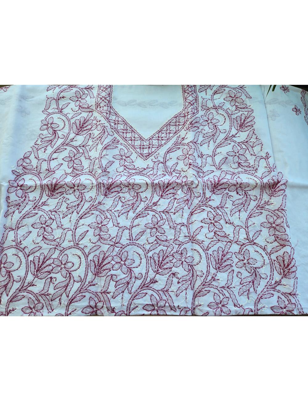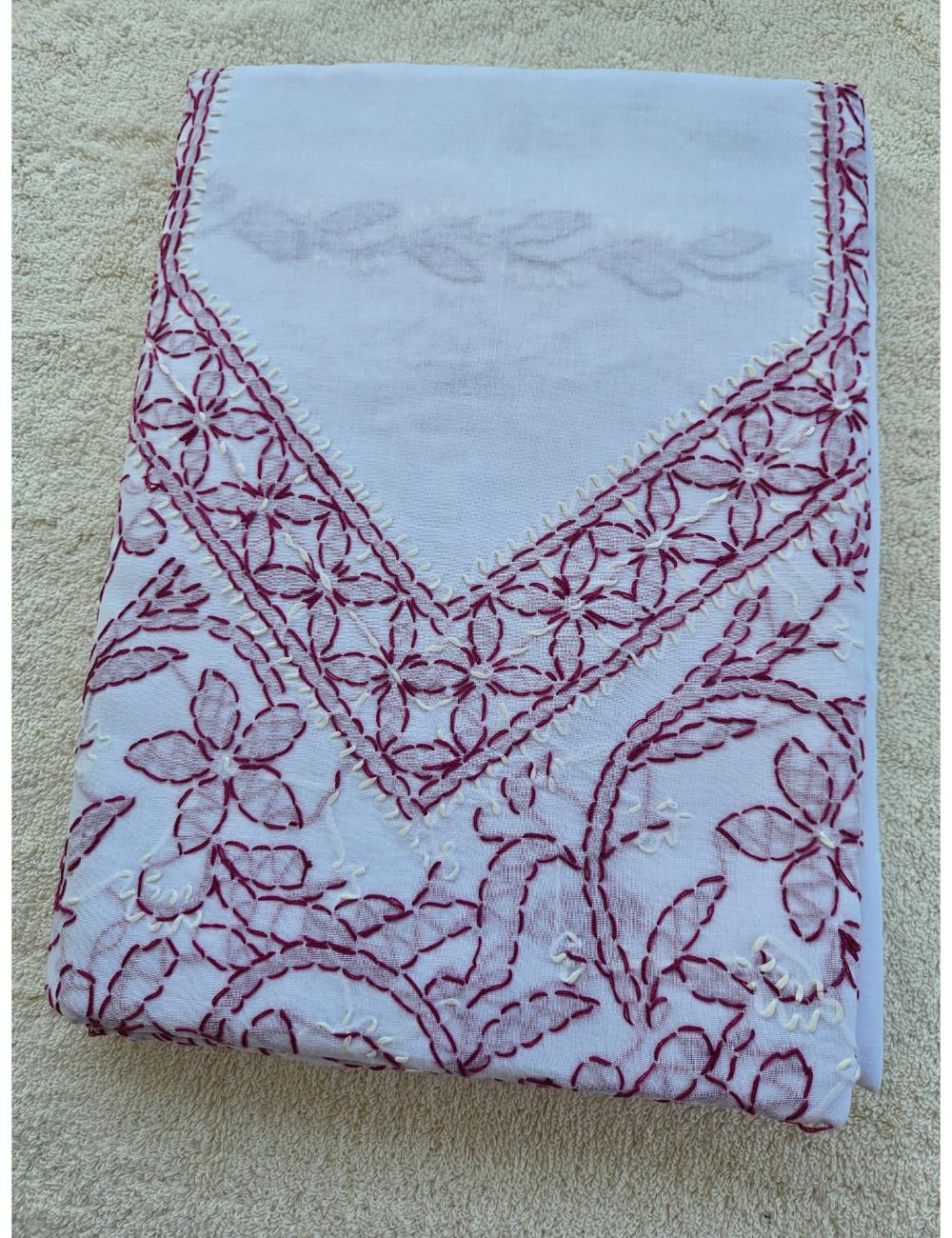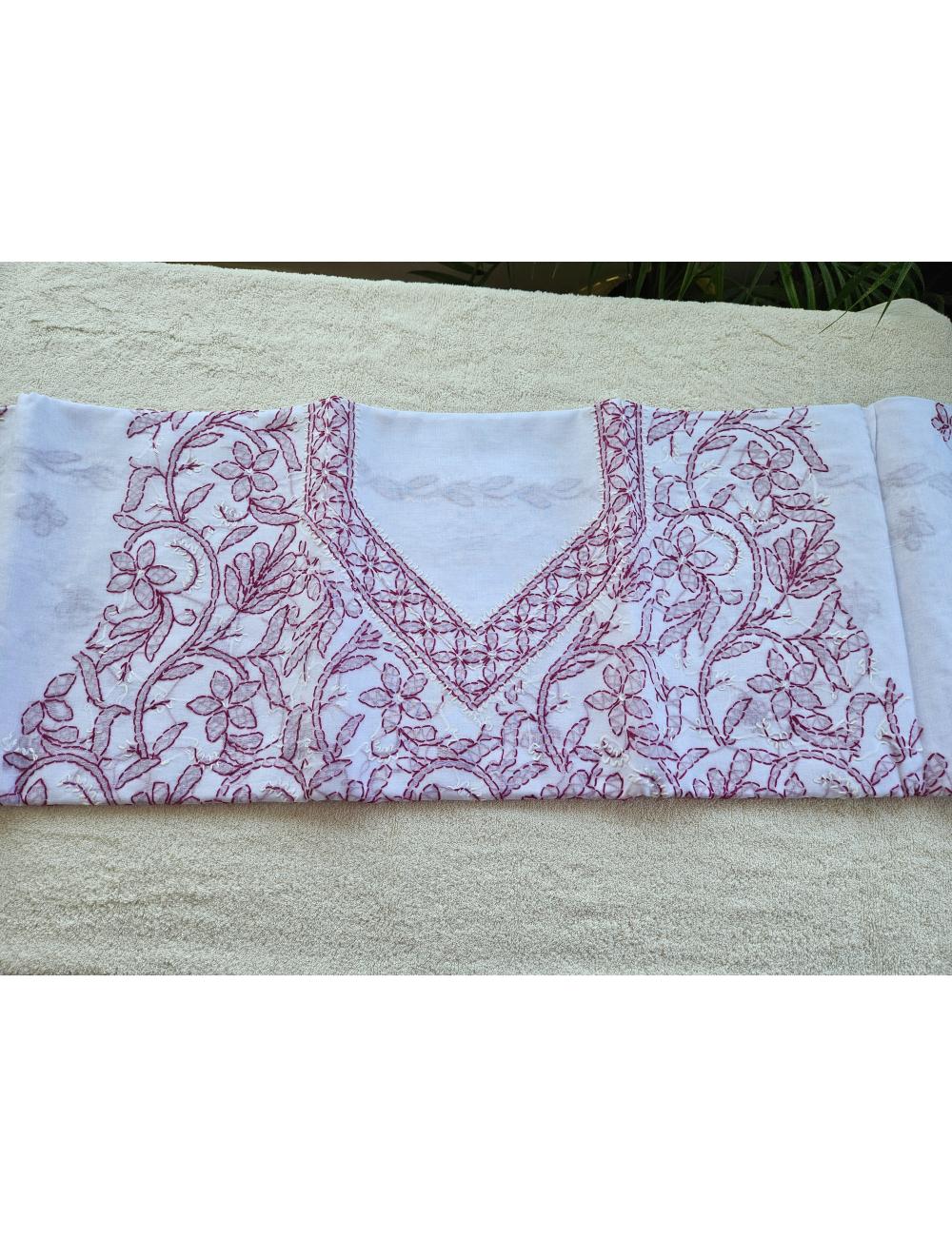Drape yourself in elegance with this 3pc white and purple Lucknow chikankari dress material, featuring intricate hand embroidery on pure cotton. The set includes a beautifully embroidered kurta, salwar and a matching dupatta fabric.