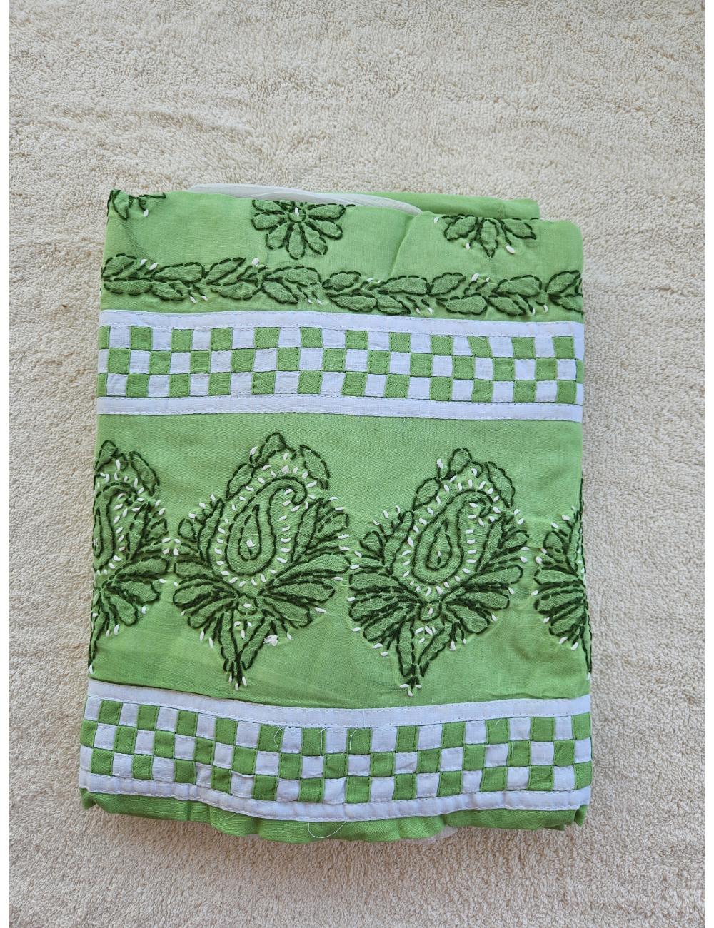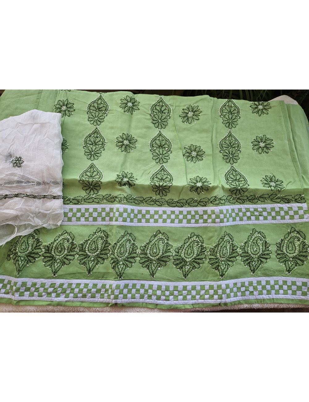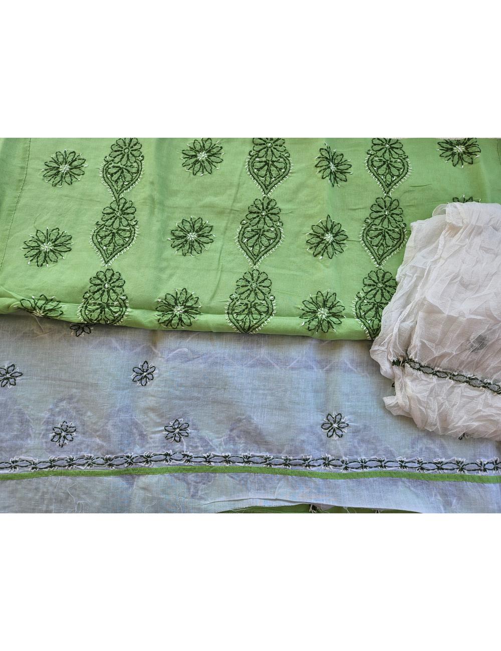 Drape yourself in elegance with this 3pc Green and White Lucknow chikankari dress material, featuring intricate hand embroidery on pure cotton. The set includes a beautifully embroidered kurta, salwar and a matching dupatta fabric.
