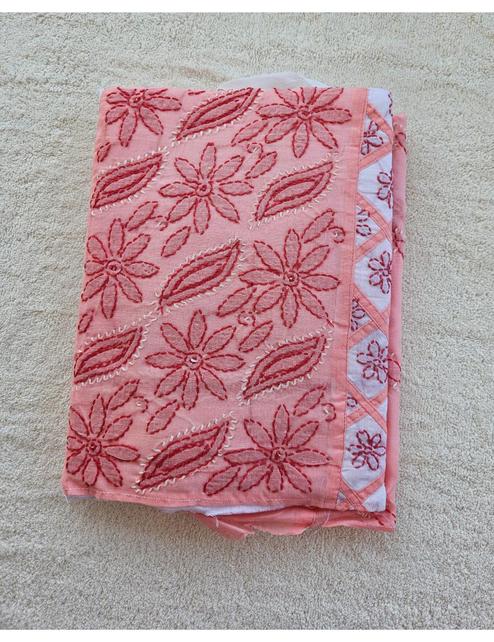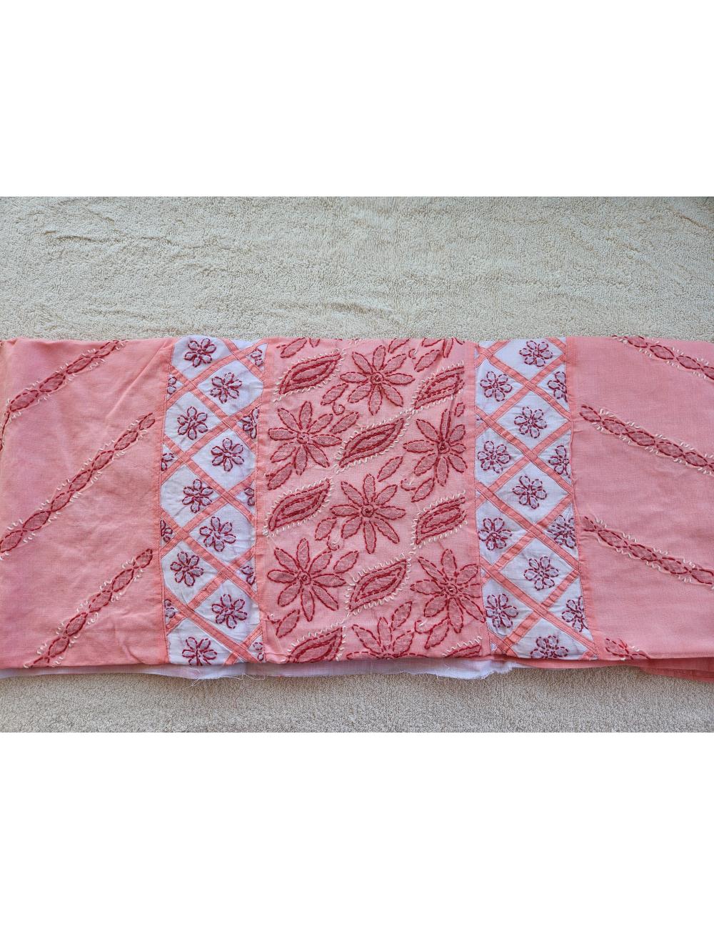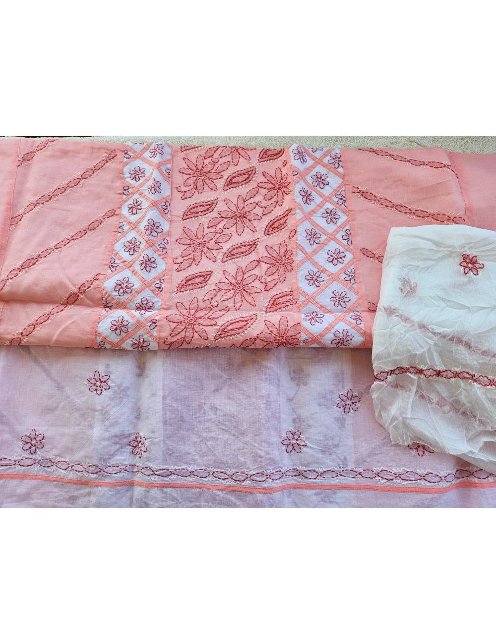Drape yourself in elegance with this 3pc Peach and White Lucknow chikankari dress material, featuring intricate hand embroidery on pure cotton. The set includes a beautifully embroidered kurta, salwar and a matching dupatta fabric.