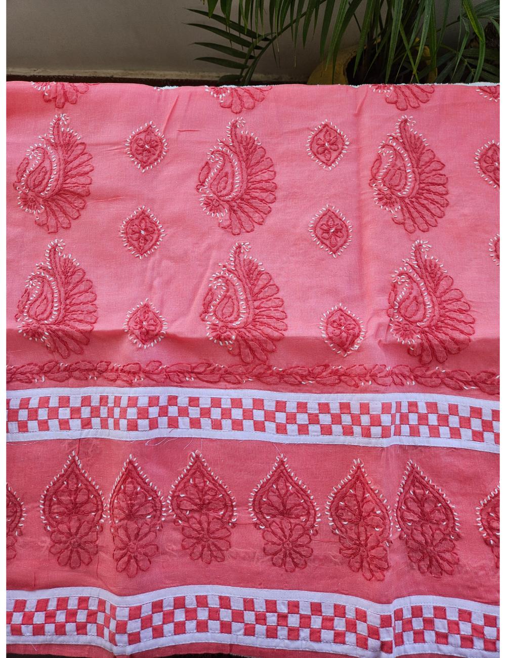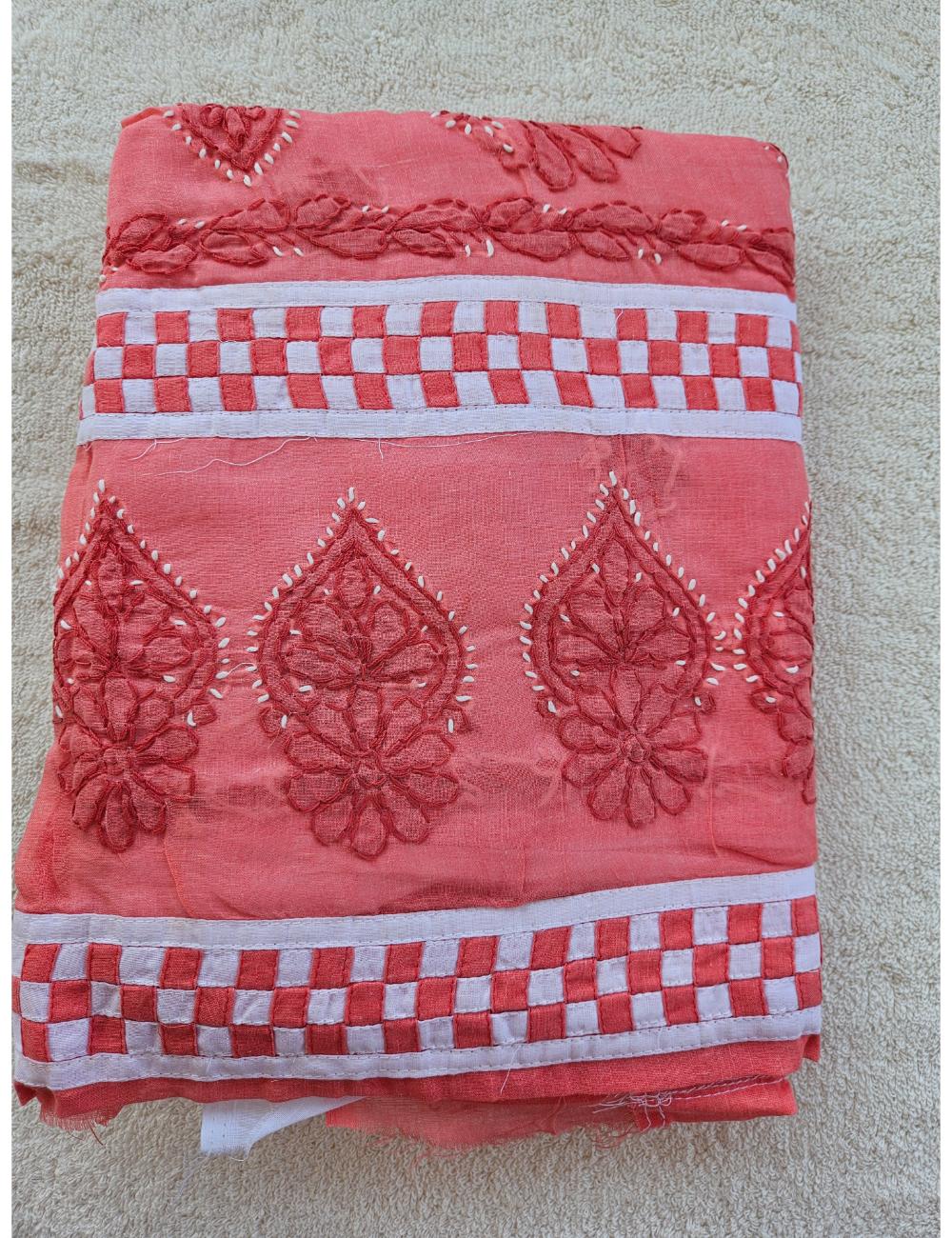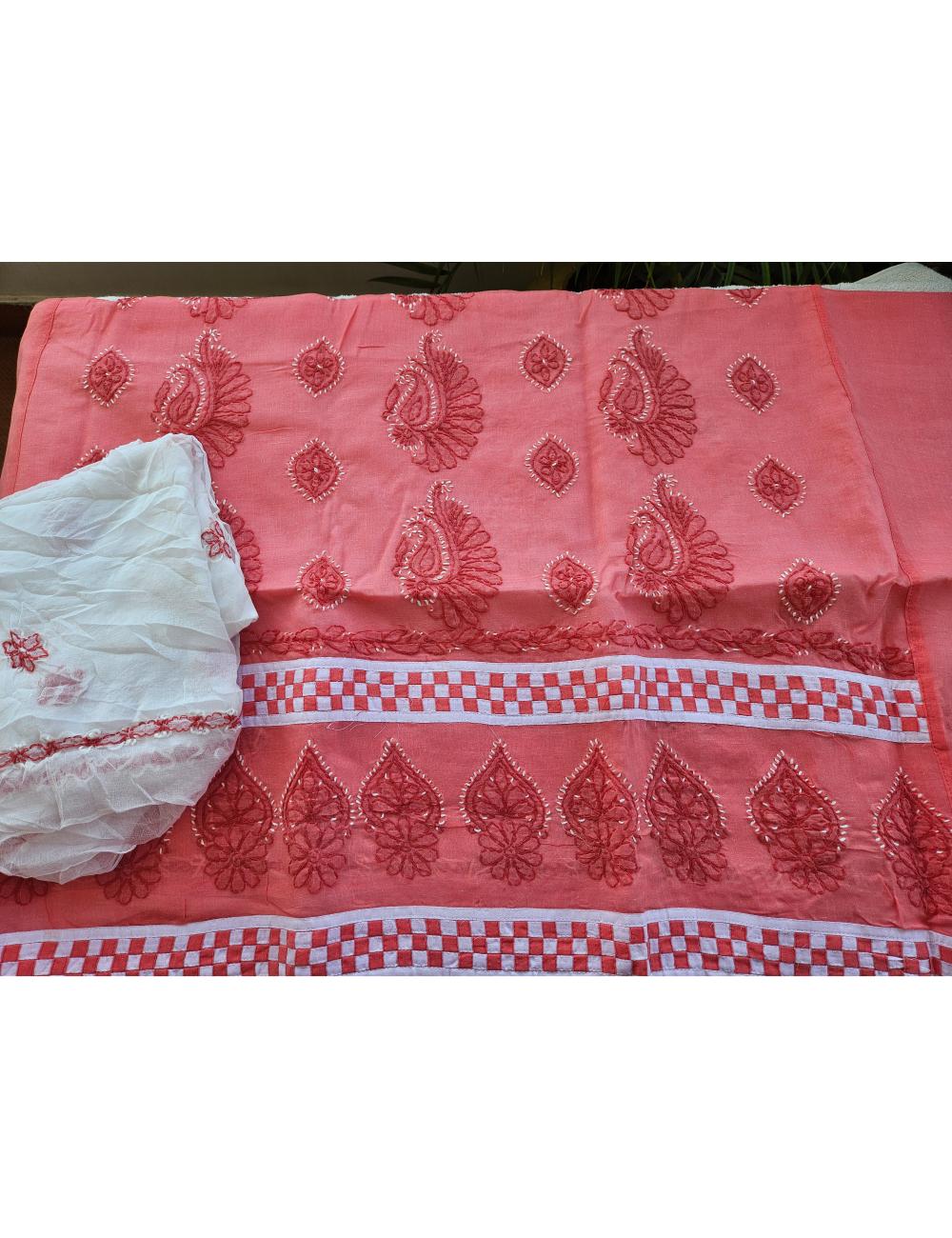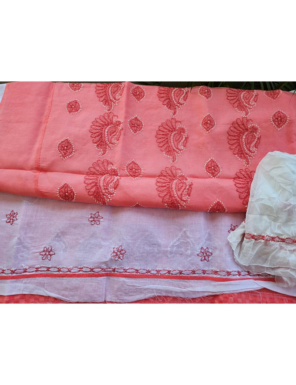 Drape yourself in elegance with this 3pc Peach and White Lucknow chikankari dress material, featuring intricate hand embroidery on pure cotton. The set includes a beautifully embroidered kurta, salwar and a matching dupatta fabric.