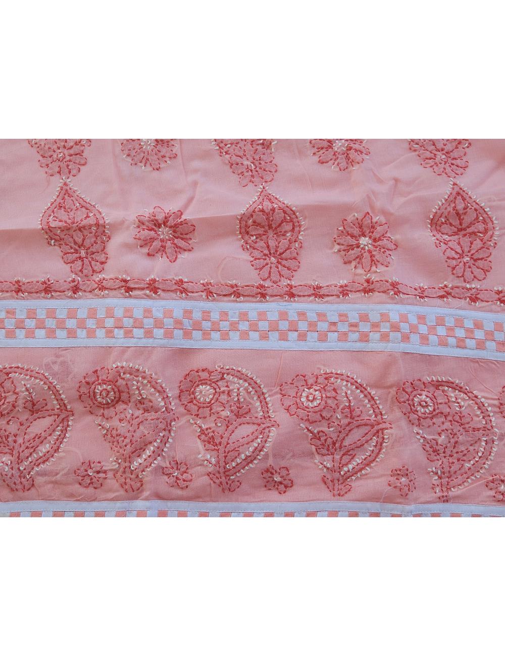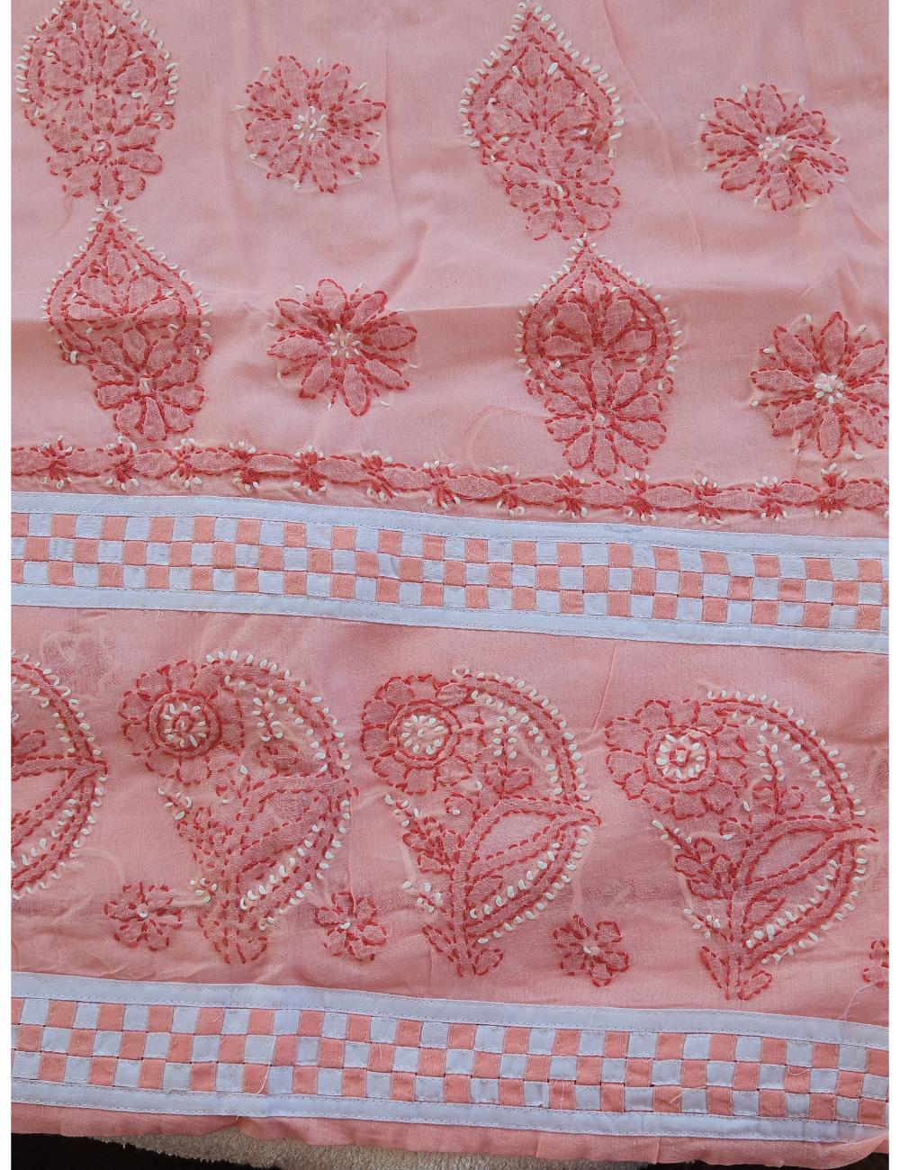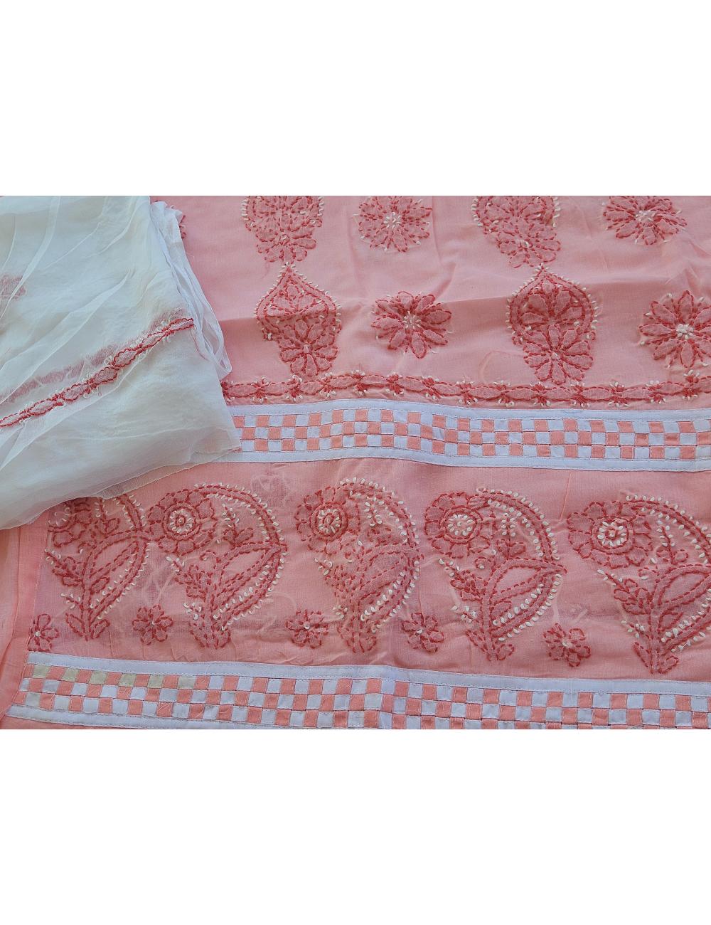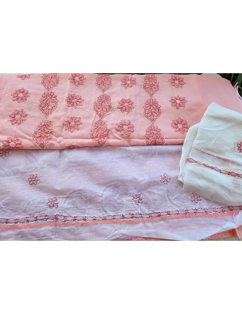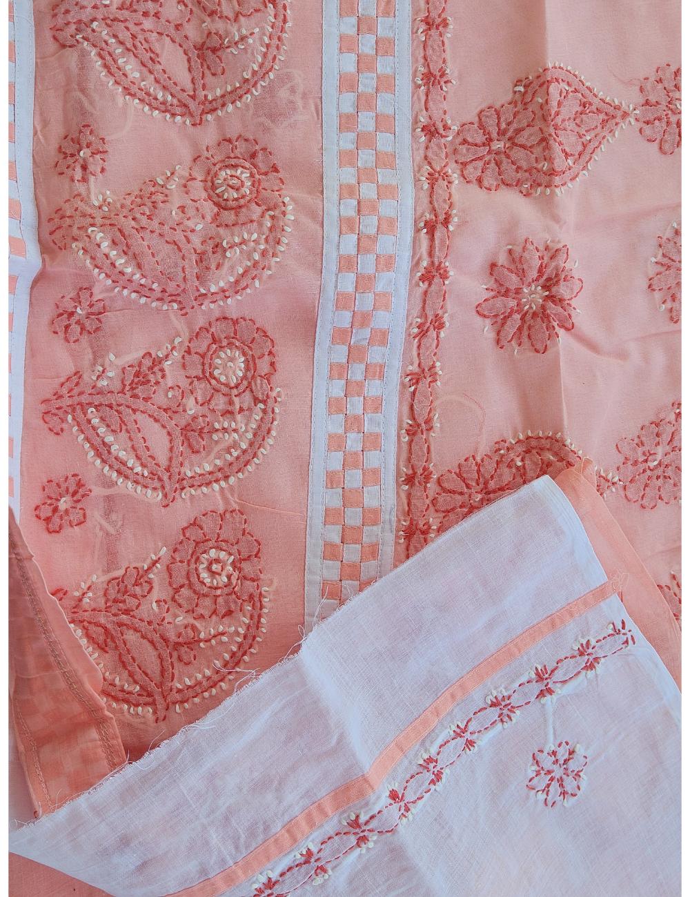 Drape yourself in elegance with this 3pc Peach and White Lucknow chikankari dress material, featuring intricate hand embroidery on pure cotton. The set includes a beautifully embroidered kurta, salwar and a matching dupatta fabric.
