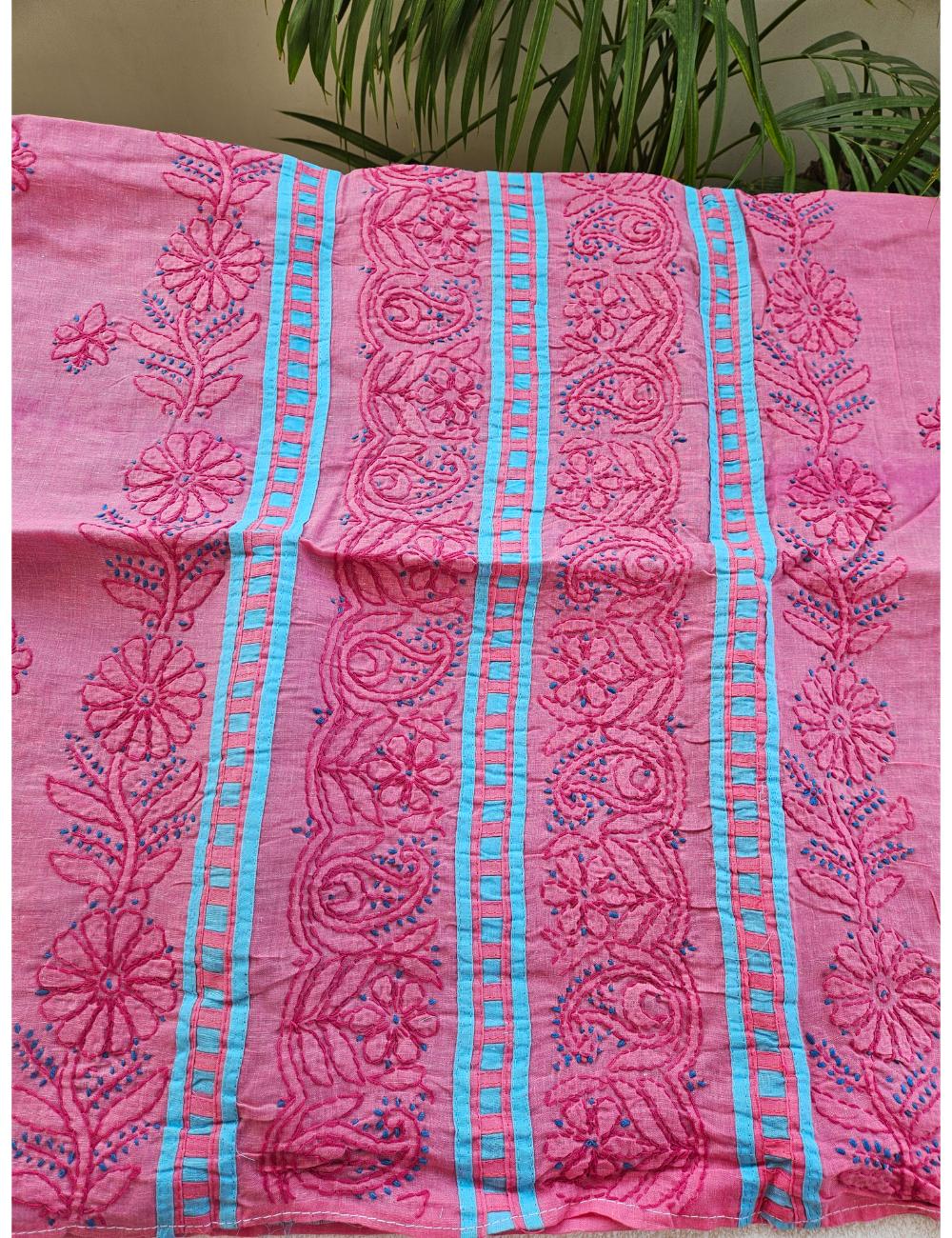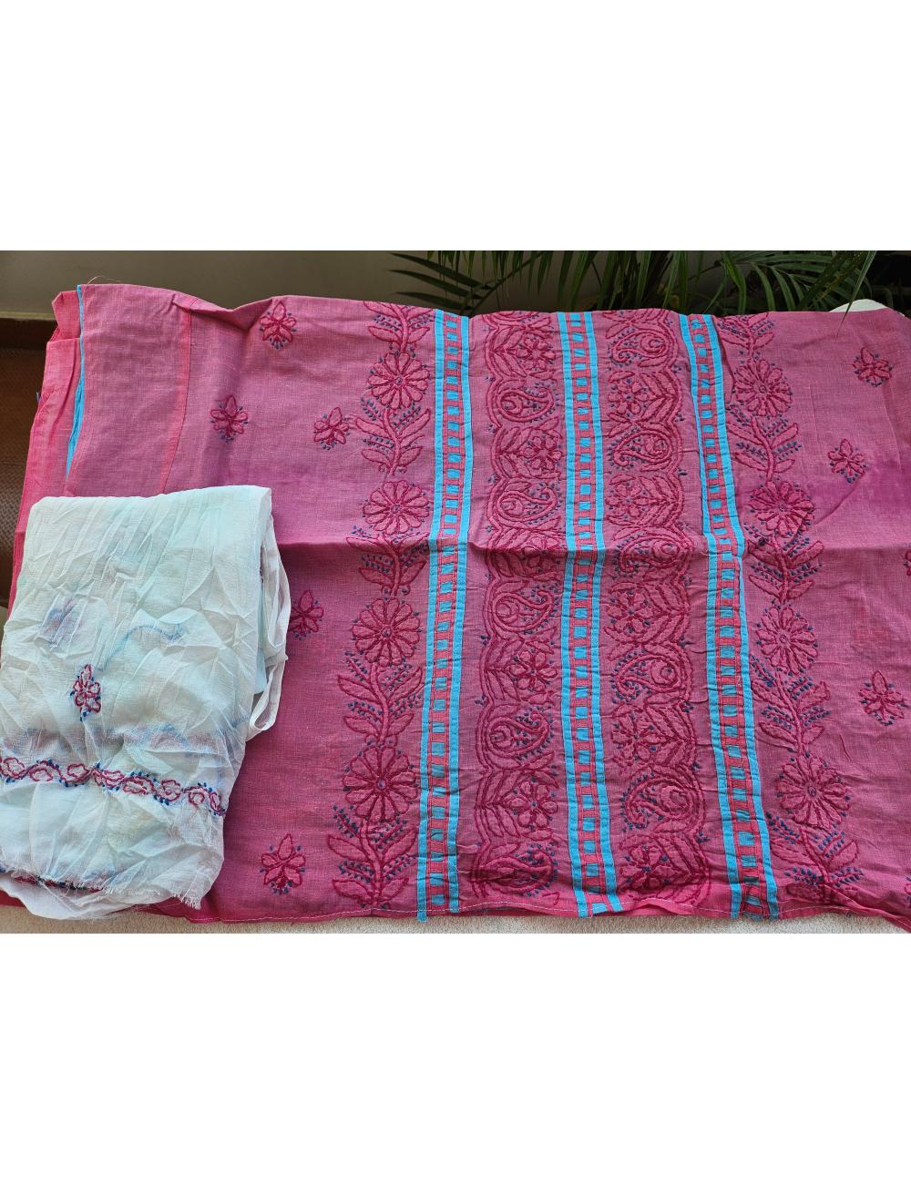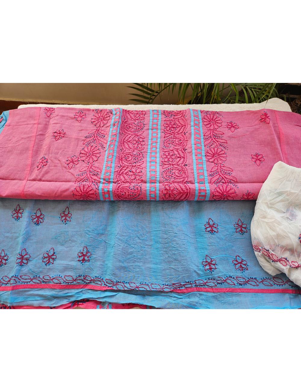 Drape yourself in elegance with this 3pc Pink and blue Lucknow chikankari dress material, featuring intricate hand embroidery on pure cotton. The set includes a beautifully embroidered kurta, salwar and a matching dupatta fabric.