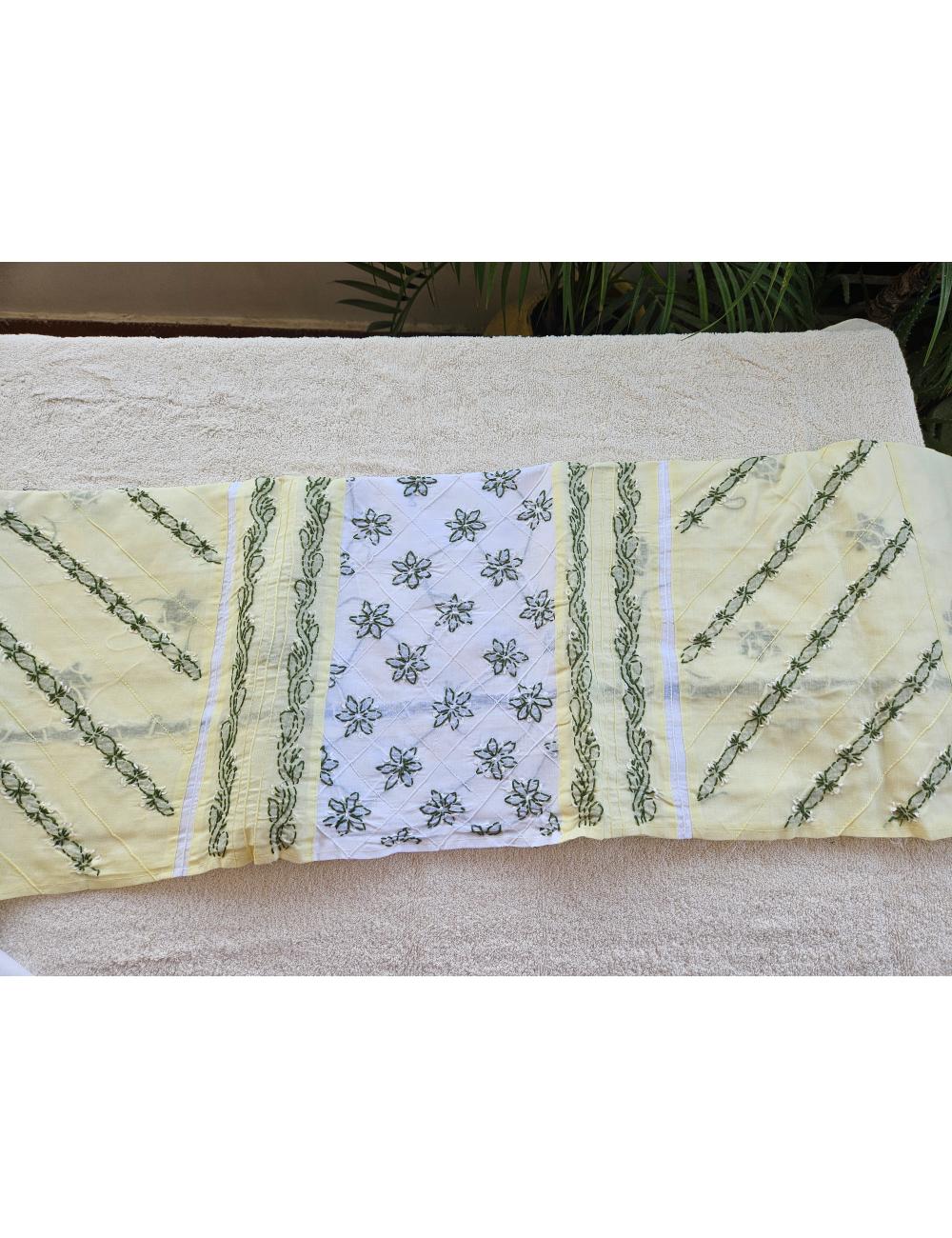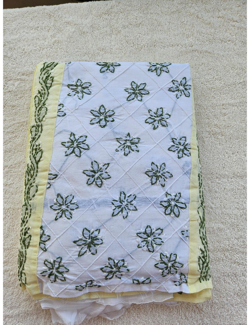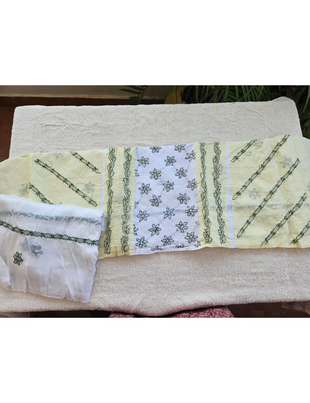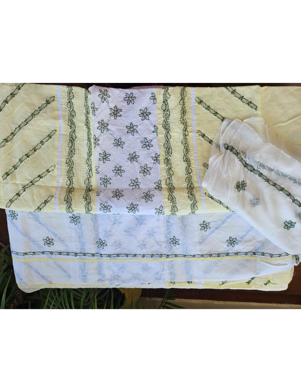 Drape yourself in elegance with this 3pc Yellow and White Lucknow chikankari dress material, featuring intricate hand embroidery on pure cotton. The set includes a beautifully embroidered kurta, salwar and a matching dupatta fabric.