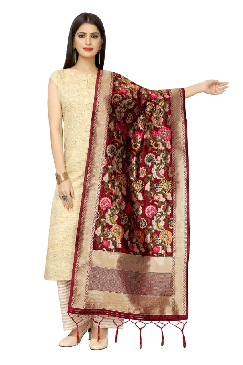 HashtagTrending Fashions presents Banarasi dupatta in multicolor floral weave patterns. This versatile accessory will be the go- to piece in your wardrobe to enhance the look of any outfit be it simple or fancy . It is a perfect gifting option for any generation and age group. Bring a refreshing twist to any look with this jacquard dupatta that is suitable for any occasion, festival and party. Make it yours or gift it to your loved ones today.