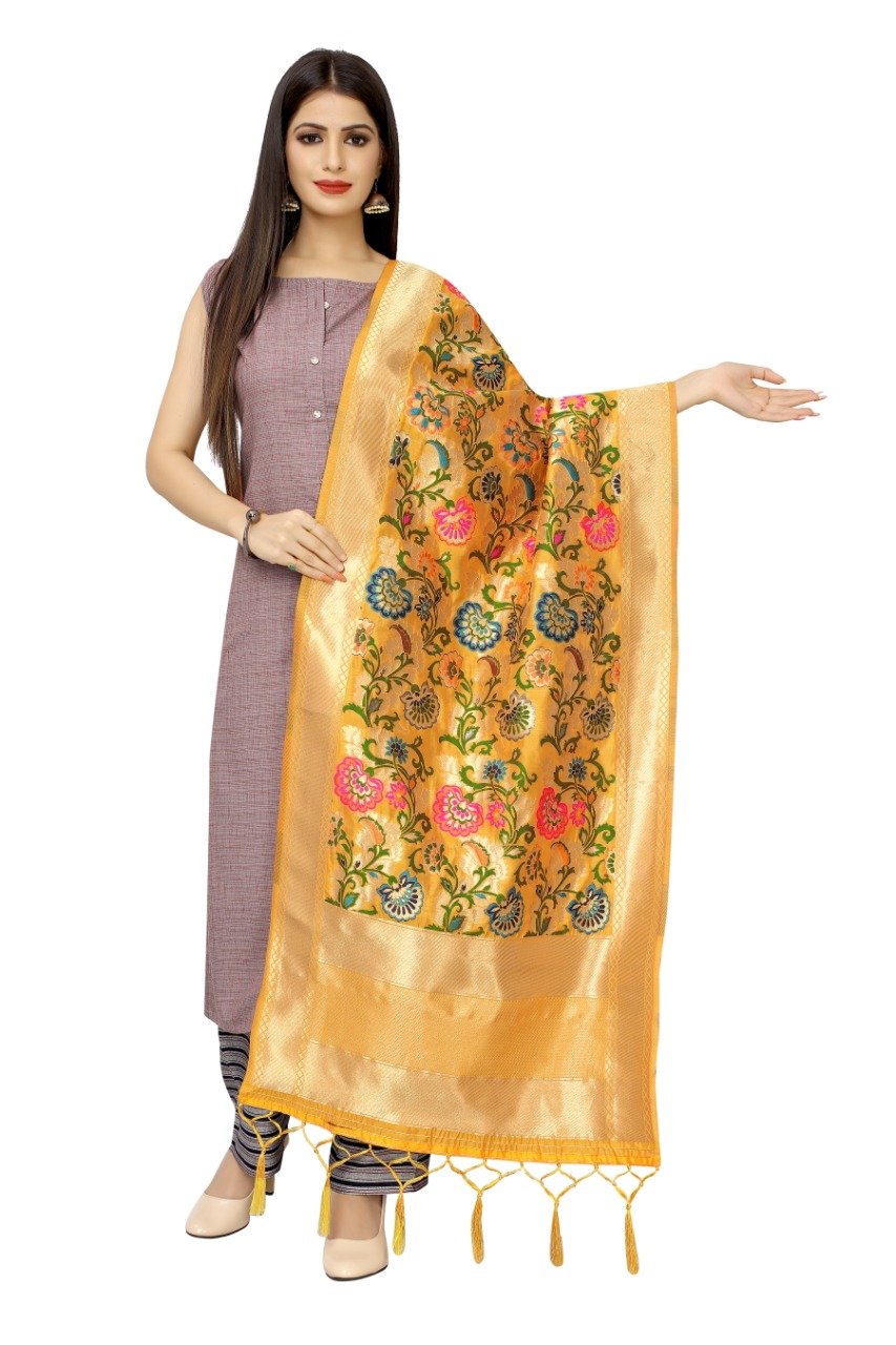 HashtagTrending Fashions presents Banarasi dupatta in multicolor floral weave patterns. This versatile accessory will be the go- to piece in your wardrobe to enhance the look of any outfit be it simple or fancy . It is a perfect gifting option for any generation and age group. Bring a refreshing twist to any look with this jacquard dupatta that is suitable for any occasion, festival and party. Make it yours or gift it to your loved ones today.