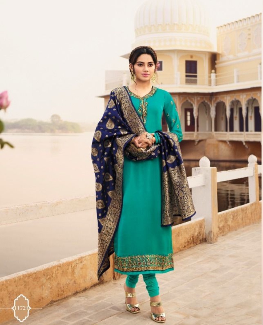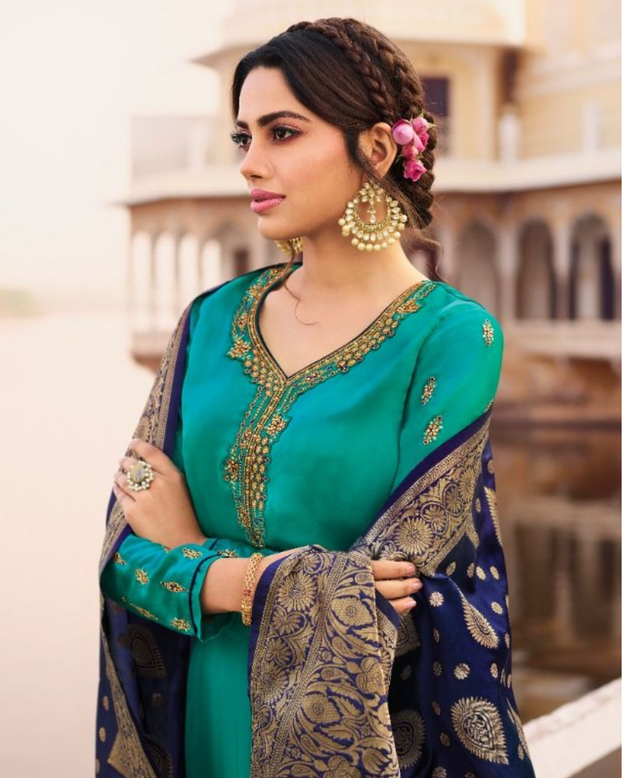 HashtagTrending Fashions brings to you beautiful Georgette silk dress material with heavy Banarasi Dupatta for festive wear. Georgette silk top with exclusive work on neck, helm and sleeves accompanied by complimenting Banarasi Jacquard dupatta is perfect for all ceremonies and functions.