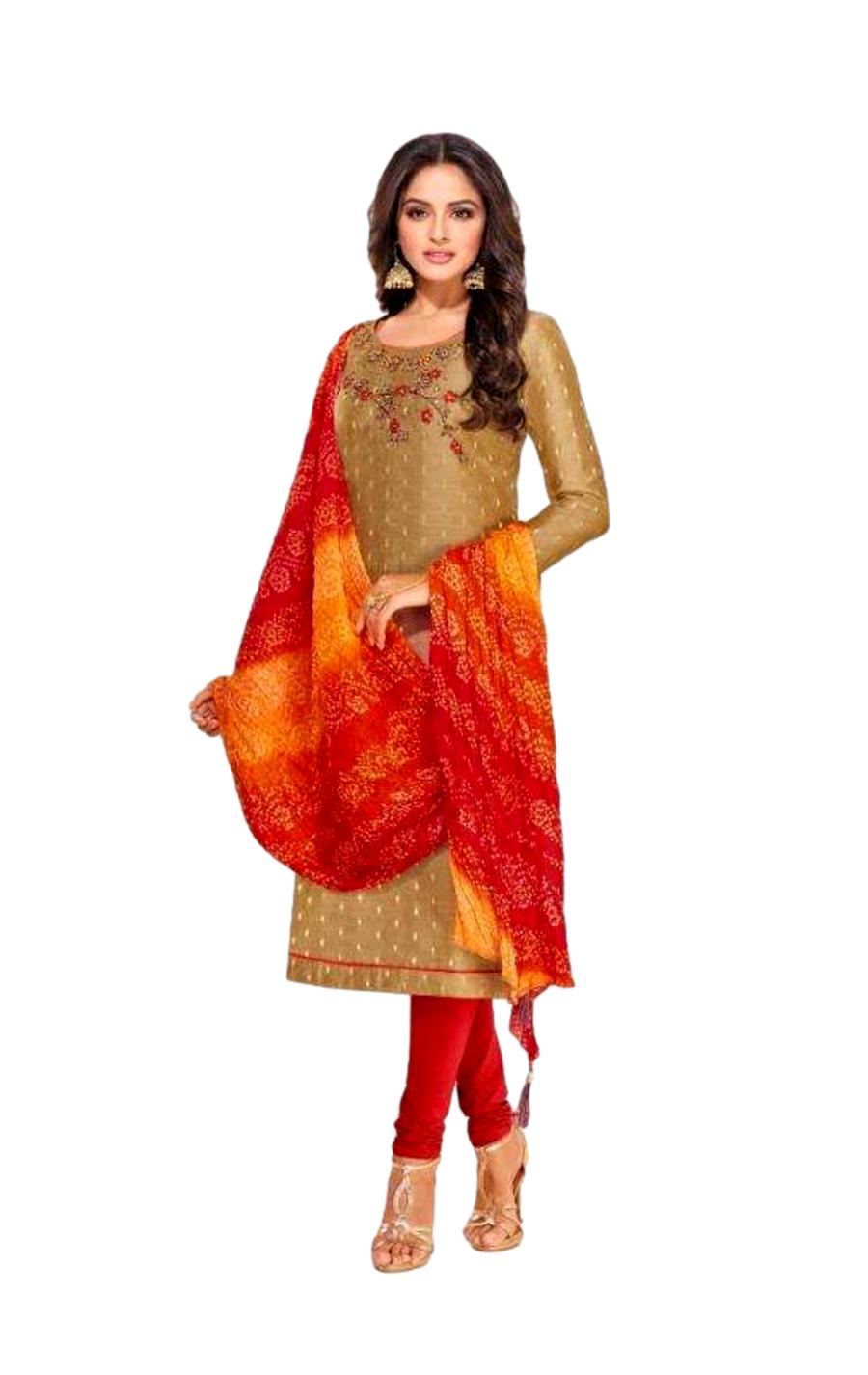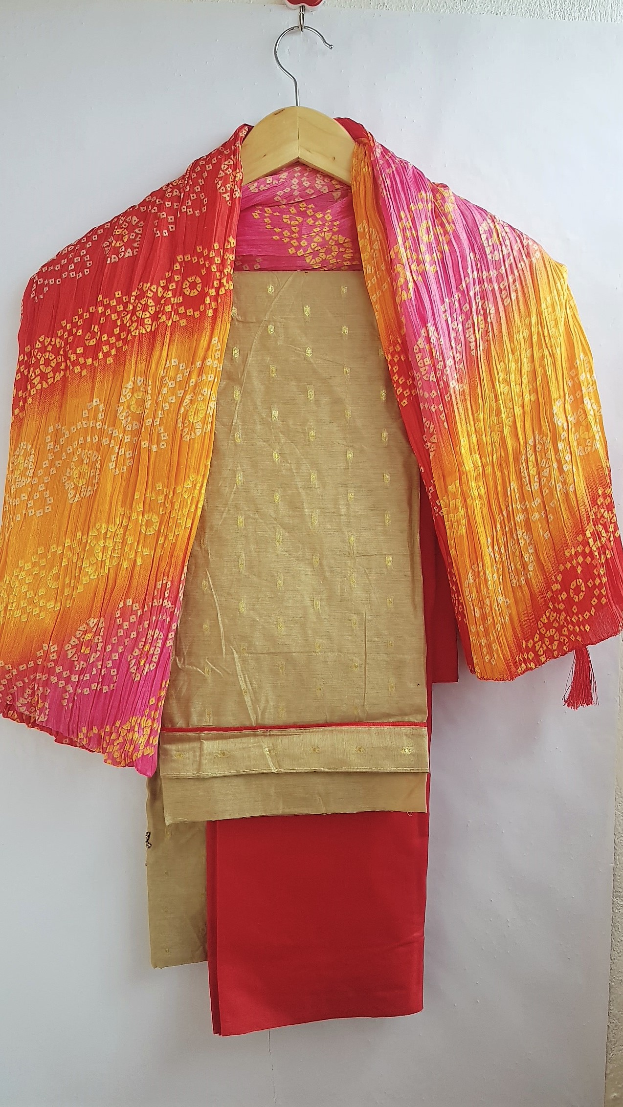 Chanderi Modal dress material with Bandhani Dupatta- Red and Gold