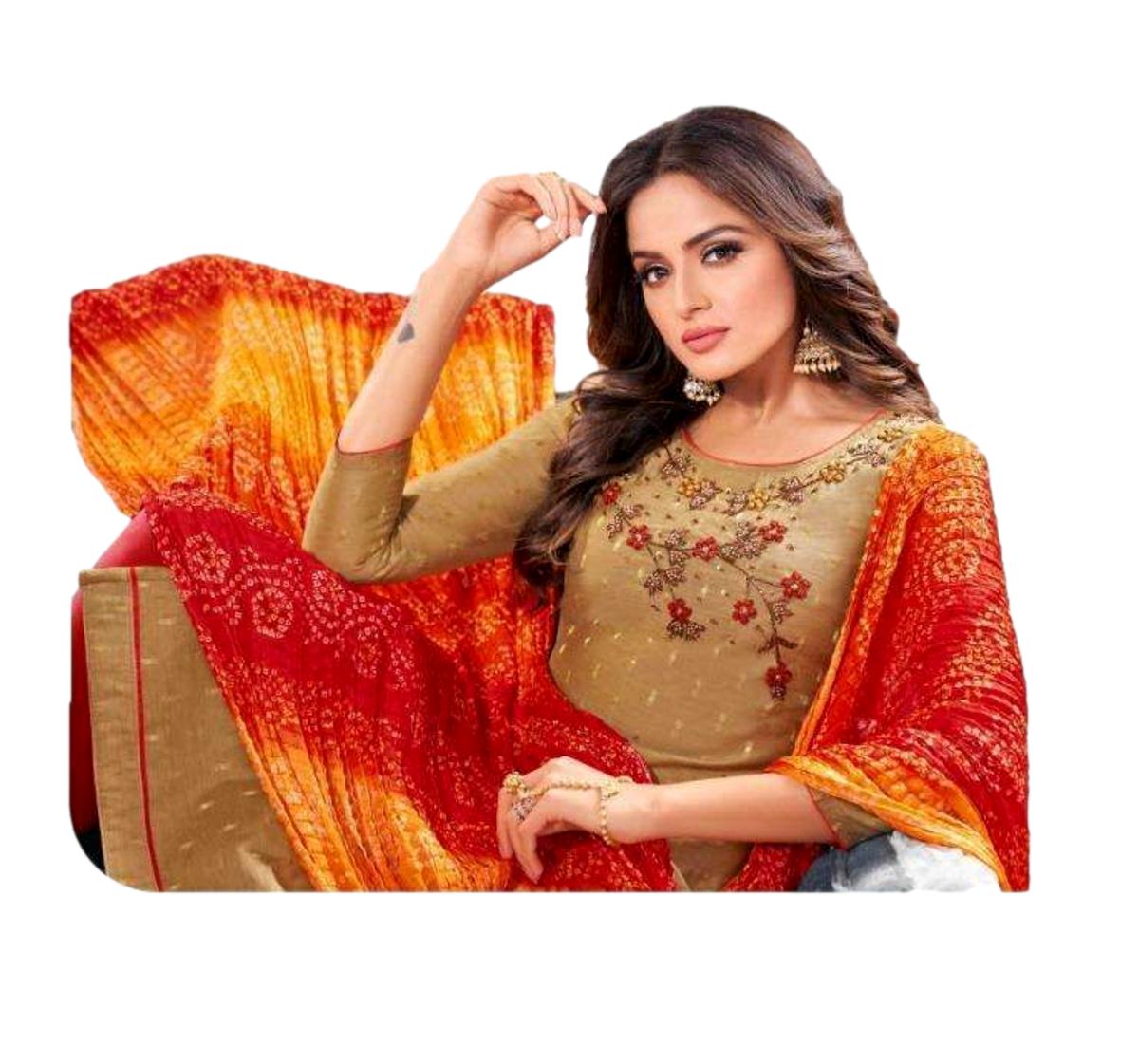 HashtagTrending Fashions brings to you vibrant chanderi modal dress material for office, college and casual wear. Classy & Traditional Chanderi Modal Butti Dress Material with beautiful handwork and Bandhej Crush Chinnon dupatta with Tassels in Vibrant colours bring happiness and joy when you wear them.