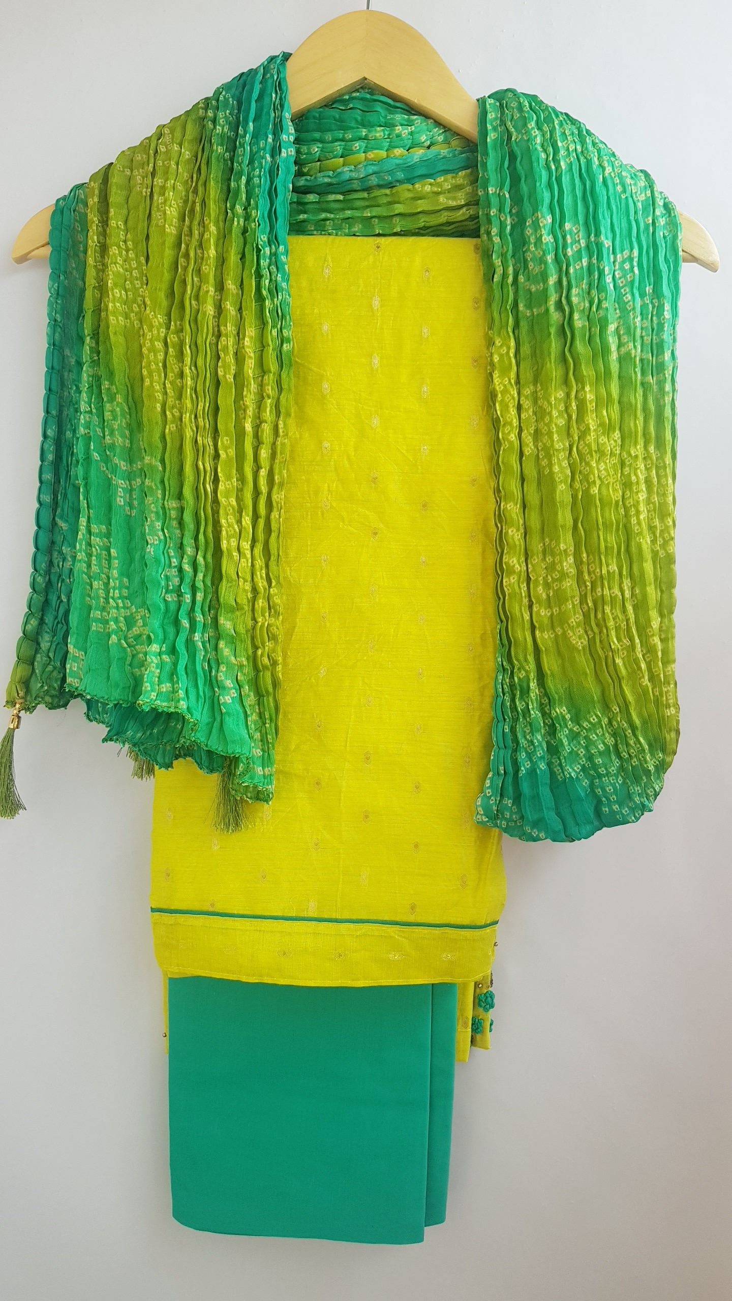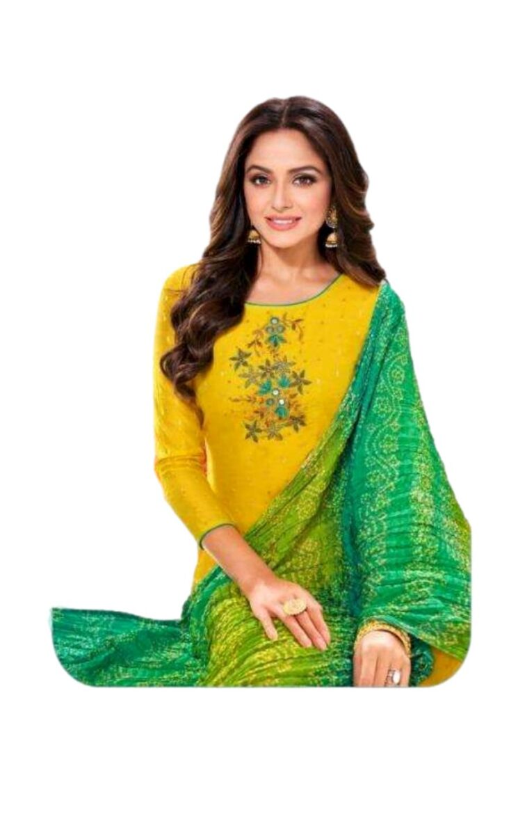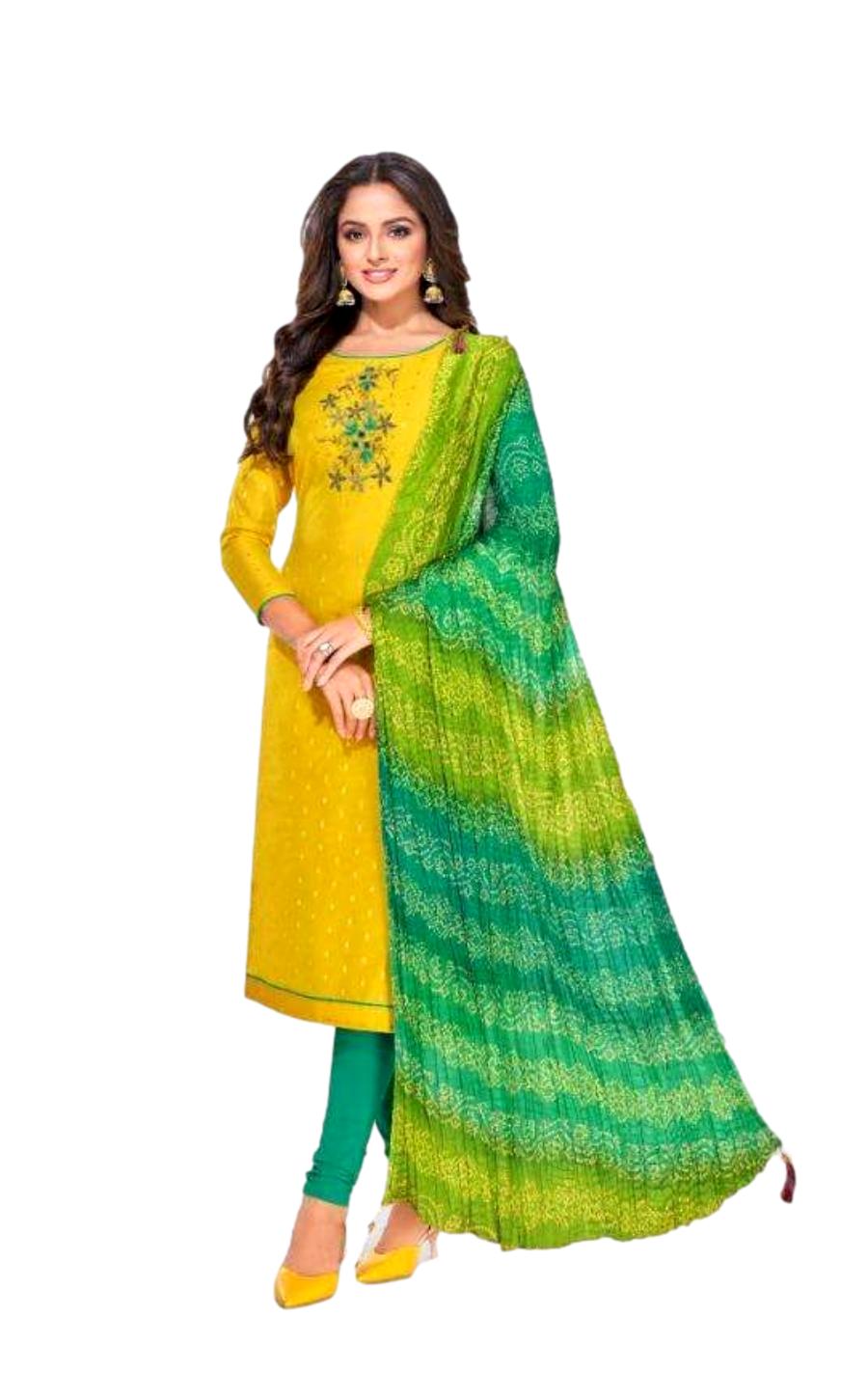 HashtagTrending Fashions brings to you vibrant chanderi modal dress material for office, college and casual wear. Classy & Traditional Chanderi Modal Butti Dress Material with beautiful handwork and Bandhej Crush Chinnon dupatta with Tassels in Vibrant colours bring happiness and joy when you wear them.