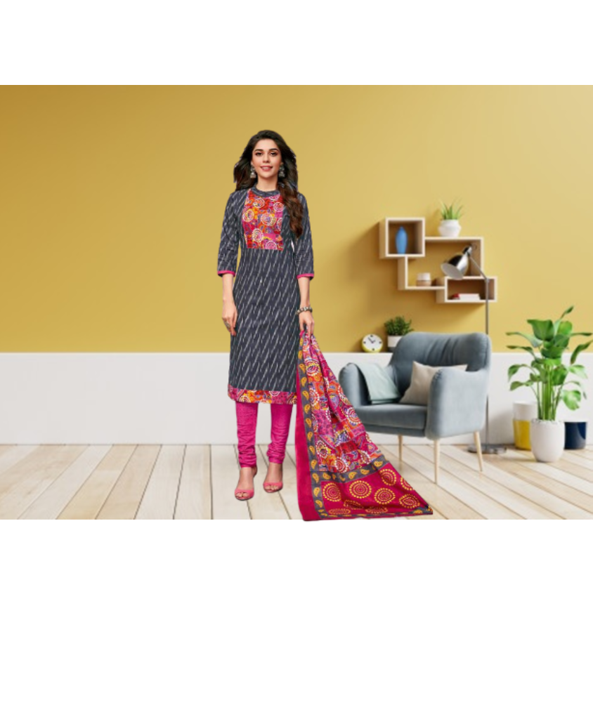 HashtagTrending Fashions brings to you beautiful printed cotton dress material for summer wear. Printed cotton grey top with printed cotton pink bottom accompanied by matching printed cotton dupatta is perfect for all day wear be it office or daily wear.