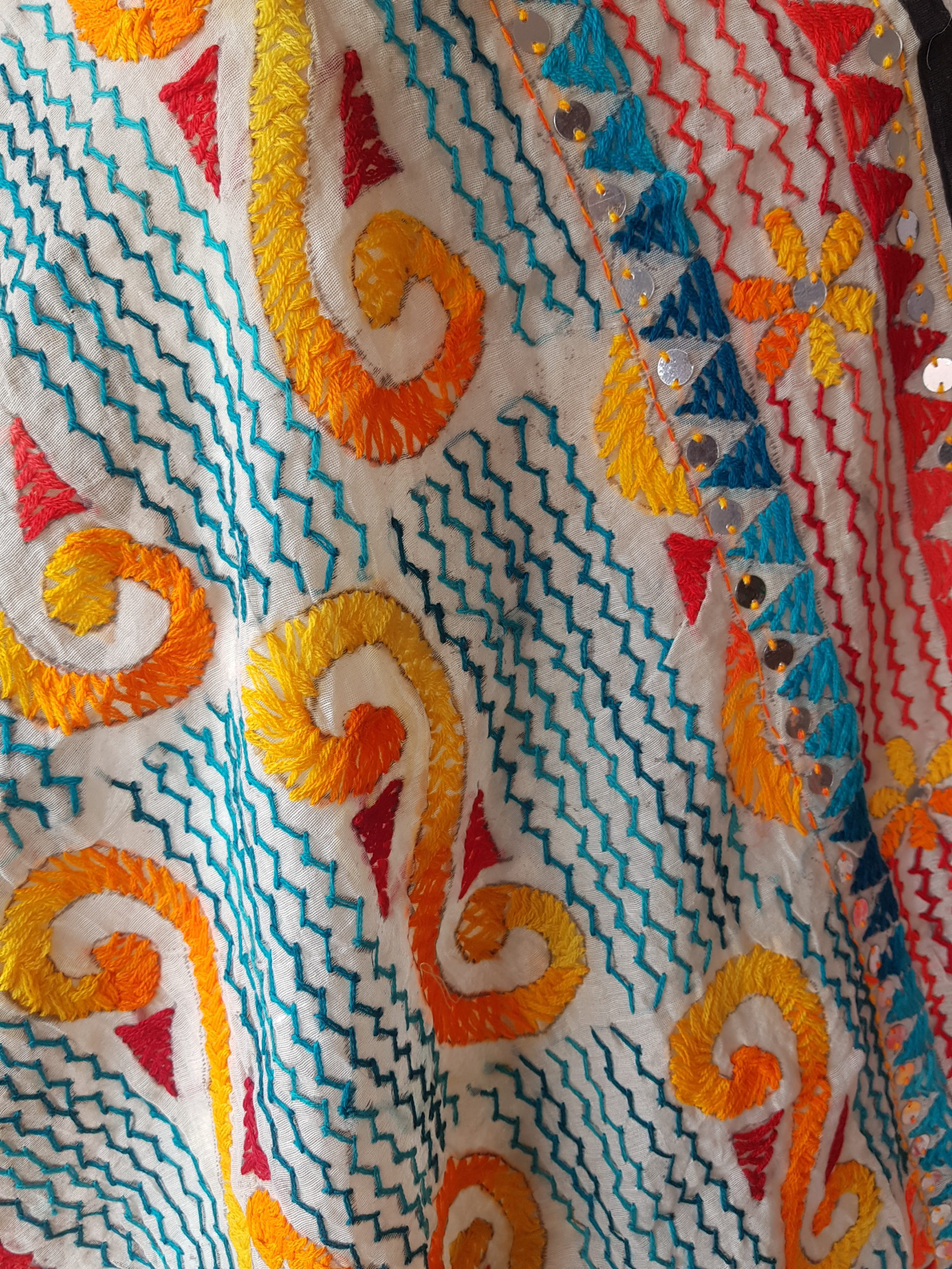 Work: Phulkari dupatta is hand-embroidered with wool with little flat faux sequins stitched in at intervals and tassels .
