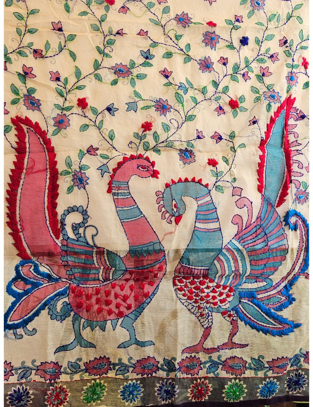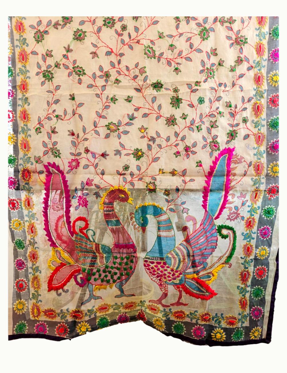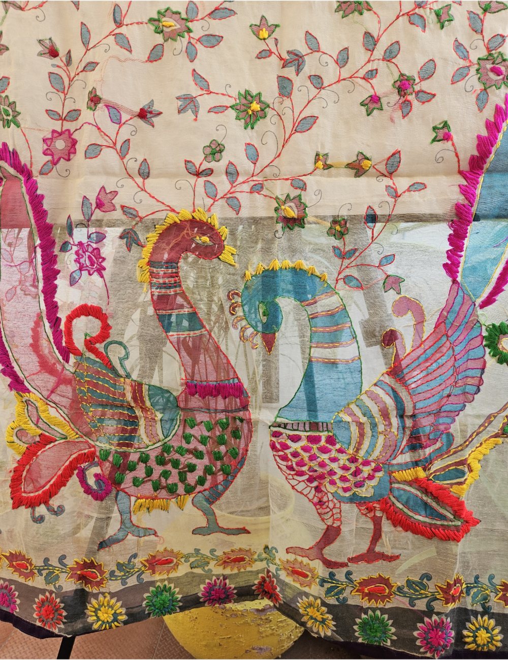Work: Heavy phulkari work with Madhubani Pattern in bright multicolored wool threads.