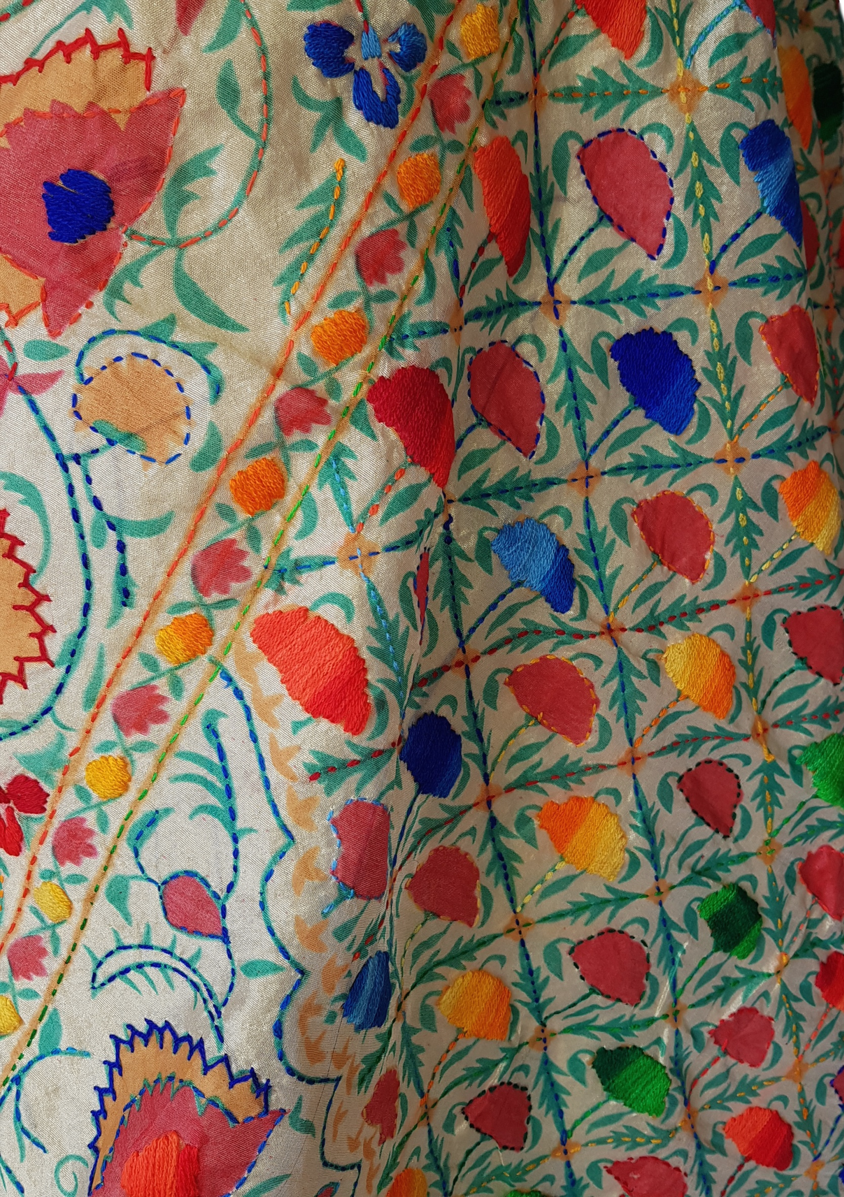 Work: Heavy phulkari work with Madhubani Pattern in bright multicolored wool threads