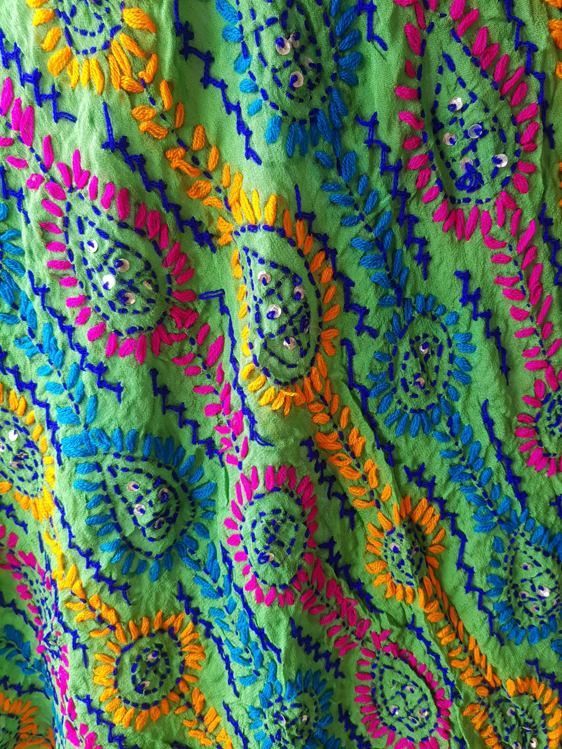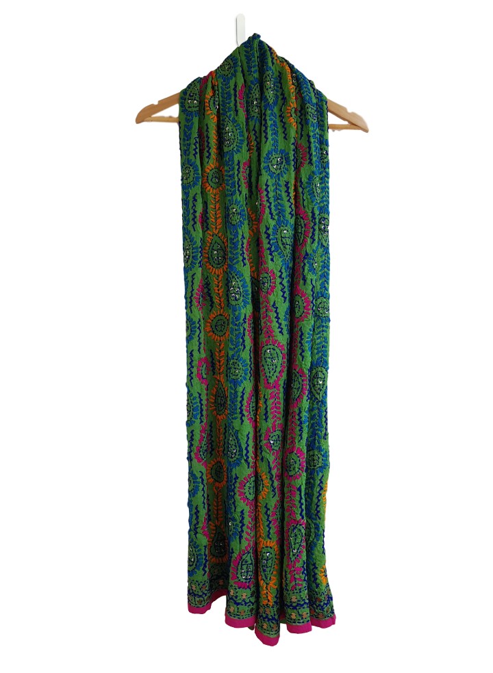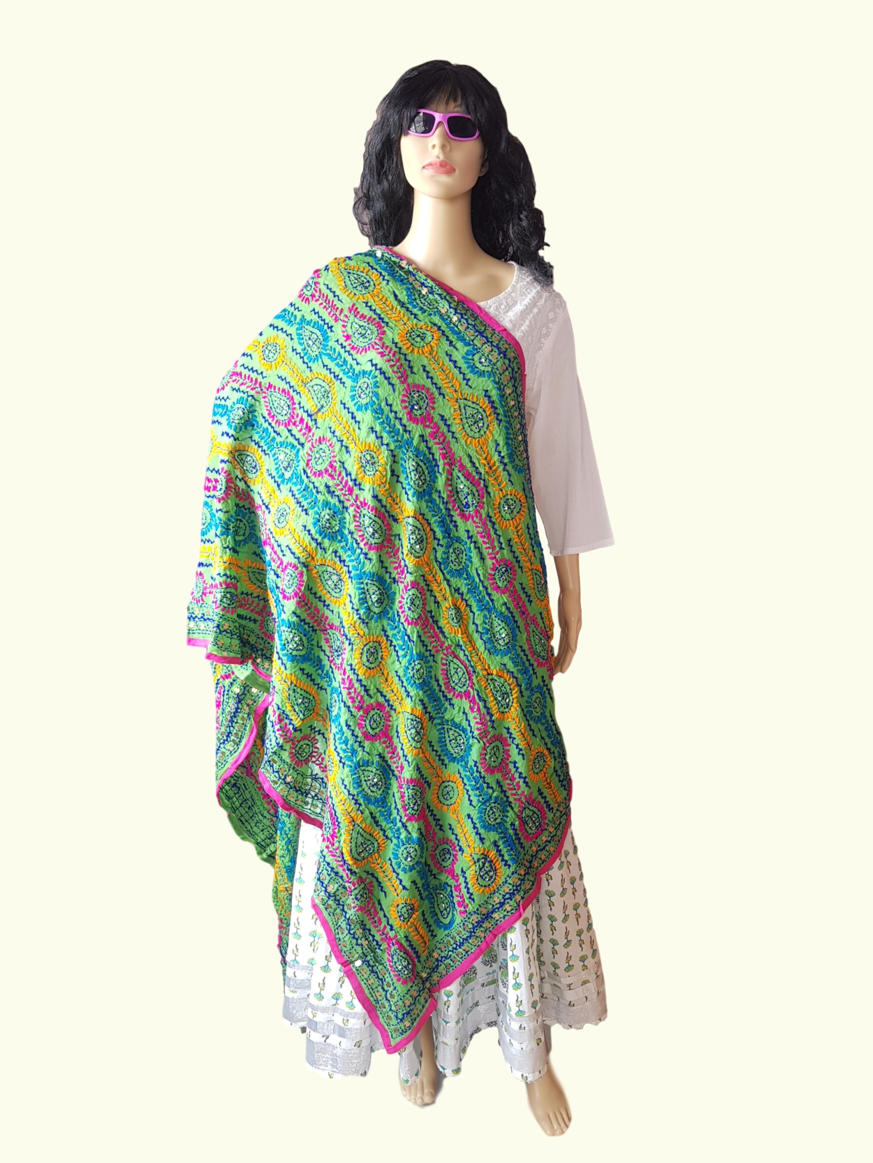 Work: Phulkari dupatta is hand-embroidered with wool with little flat faux sequins stitched in at intervals.