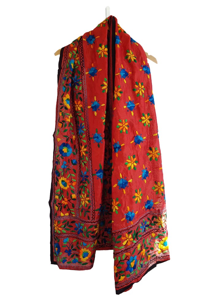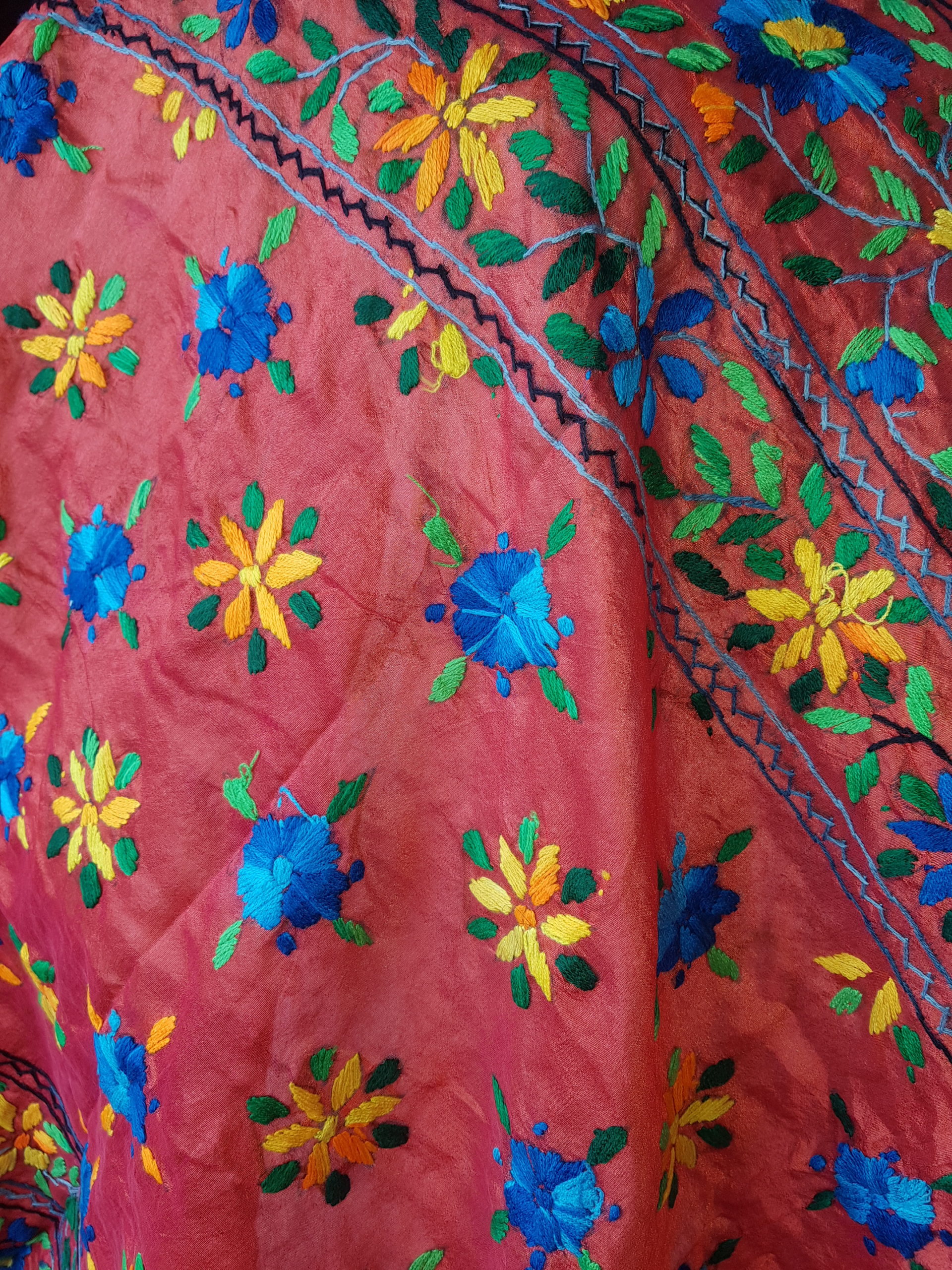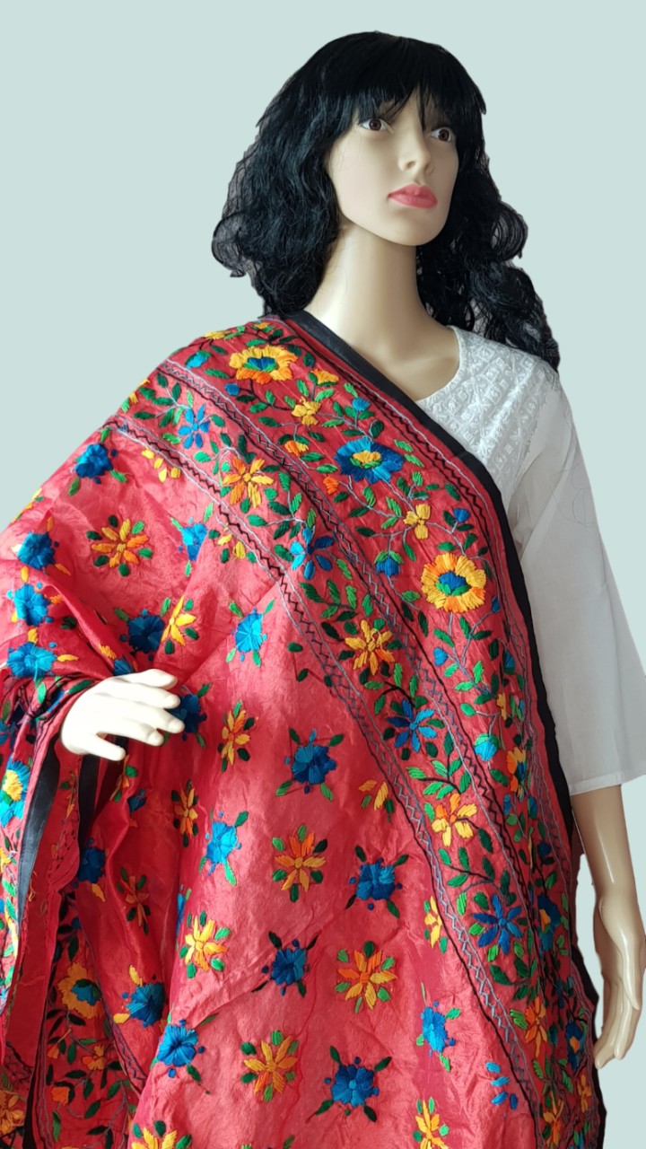 Work: Hand-embroidered Phulkai with wool in champa work pattern,
