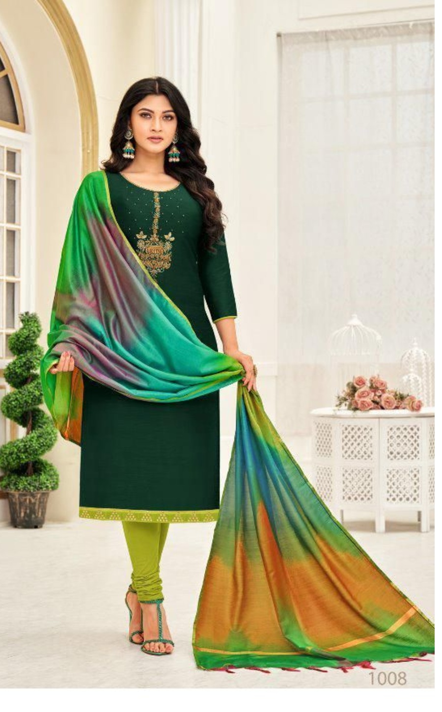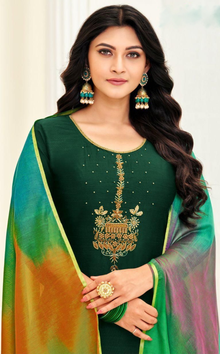 HashtagTrending Fashions brings to you vibrant modal slub dress material for office, college and casual wear. Classy & Traditional top with beautiful handwork and Rainbow Banarasi dupatta with Tassels in Vibrant colours complimented by bottom in ccontrasting color bring happiness and joy when you wear them.