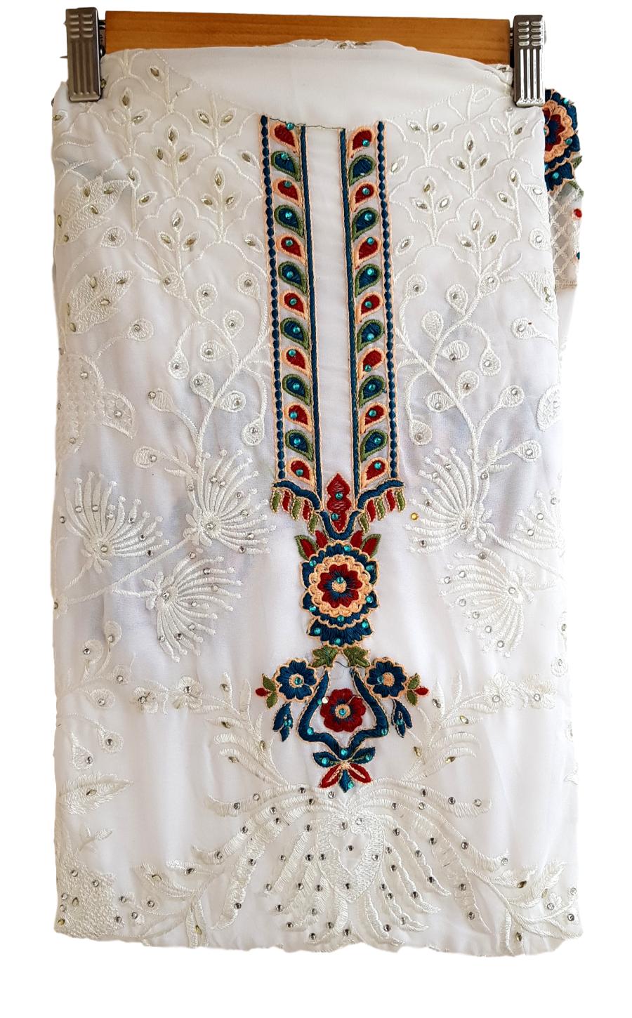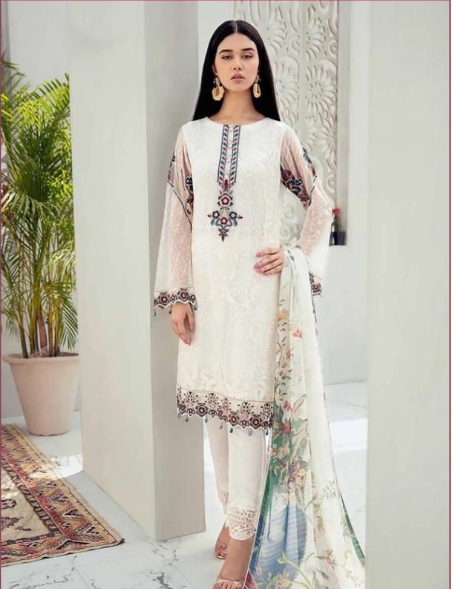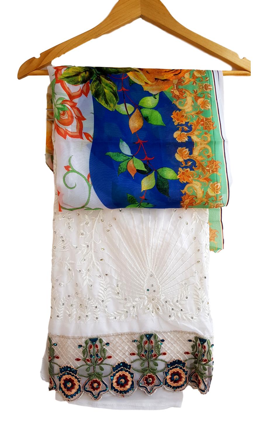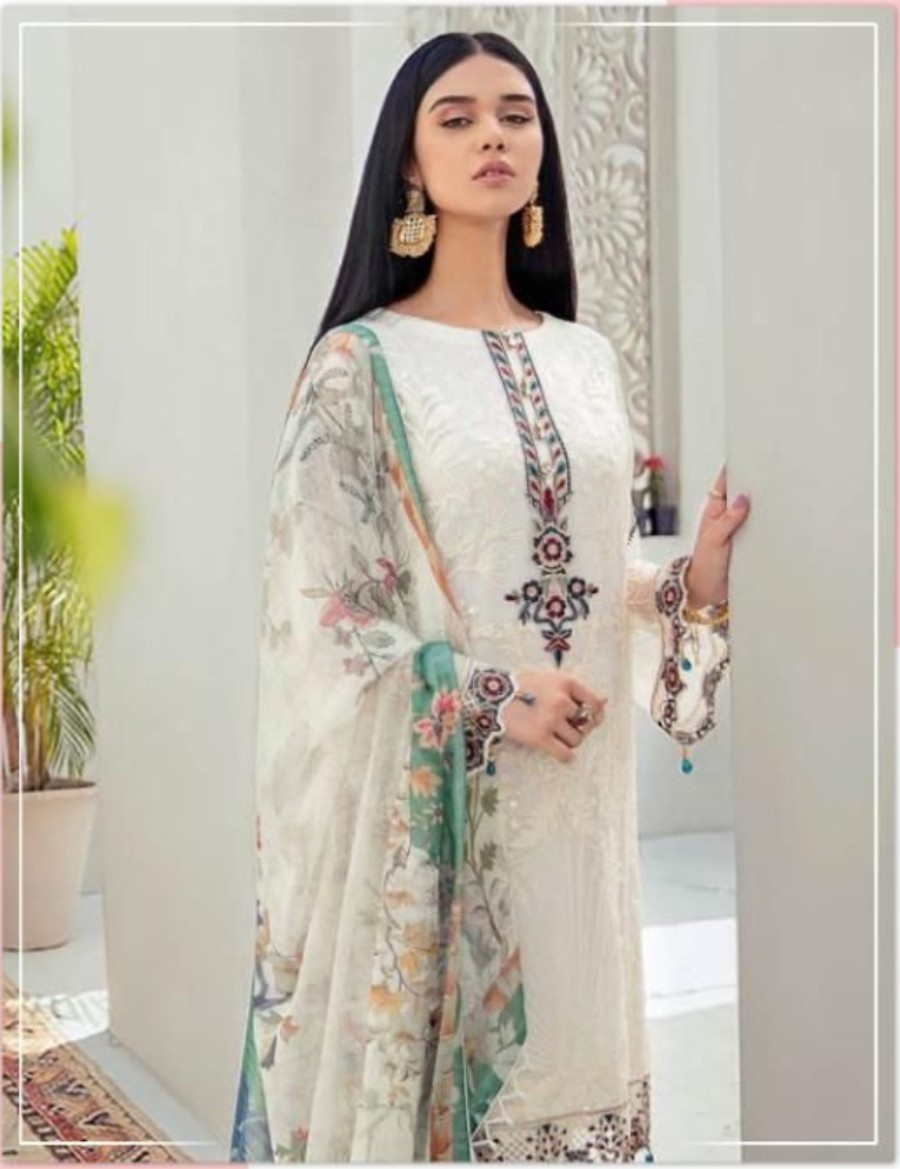 HashtagTrending Fashions brings to you beautiful Pakistani style Georgette dress material with heavy embroidered top and Santoon bottom accompanied by complimenting dgital printed Naznin dupatta perfect for all ceremonies, parties and functions.