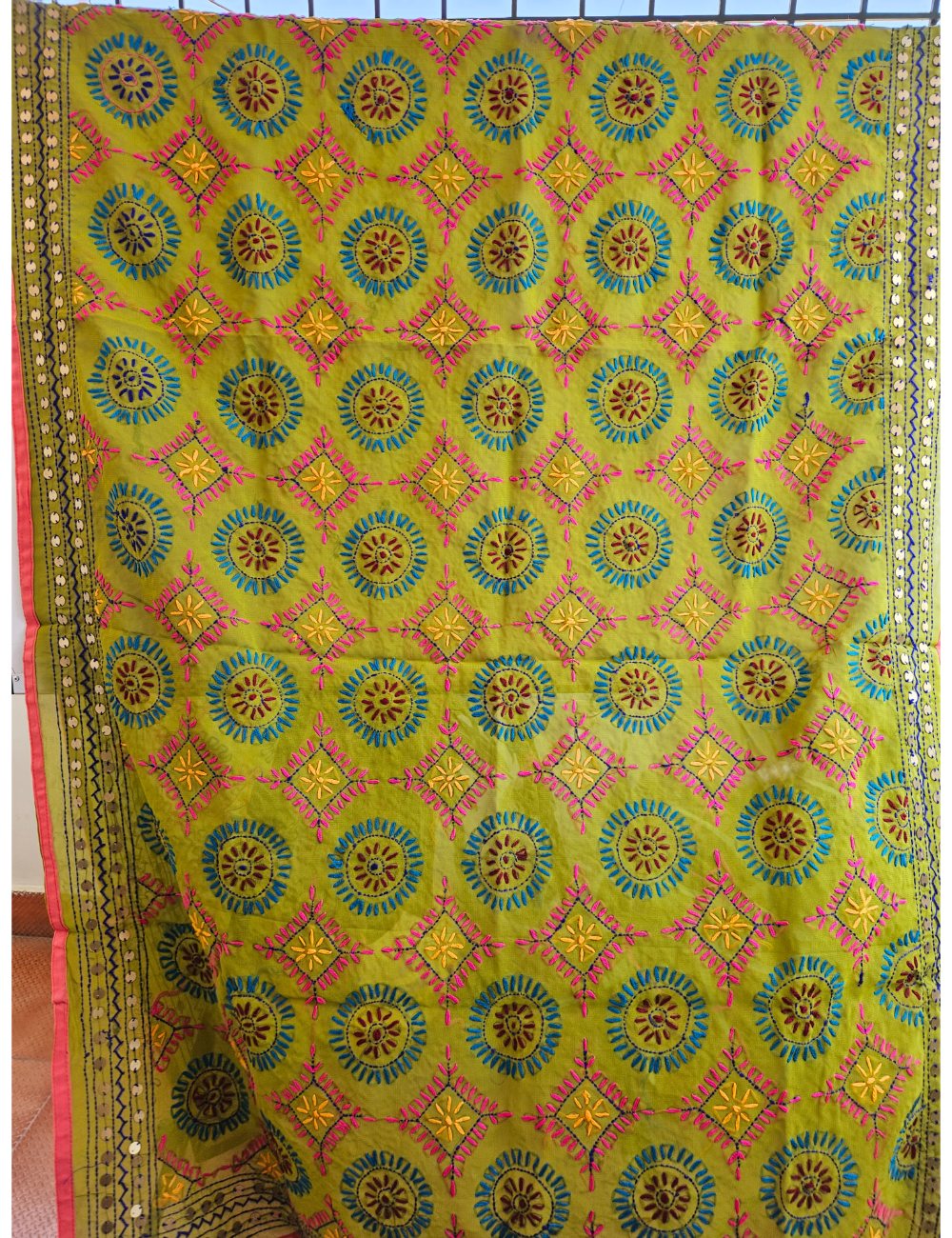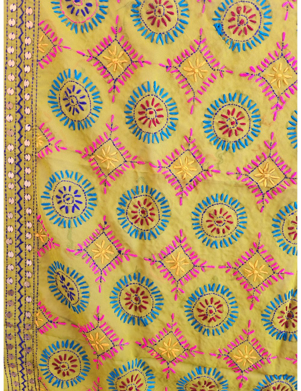 Work: Phulkari dupatta is hand-embroidered with wool with little flat faux sequins stitched in at intervals.