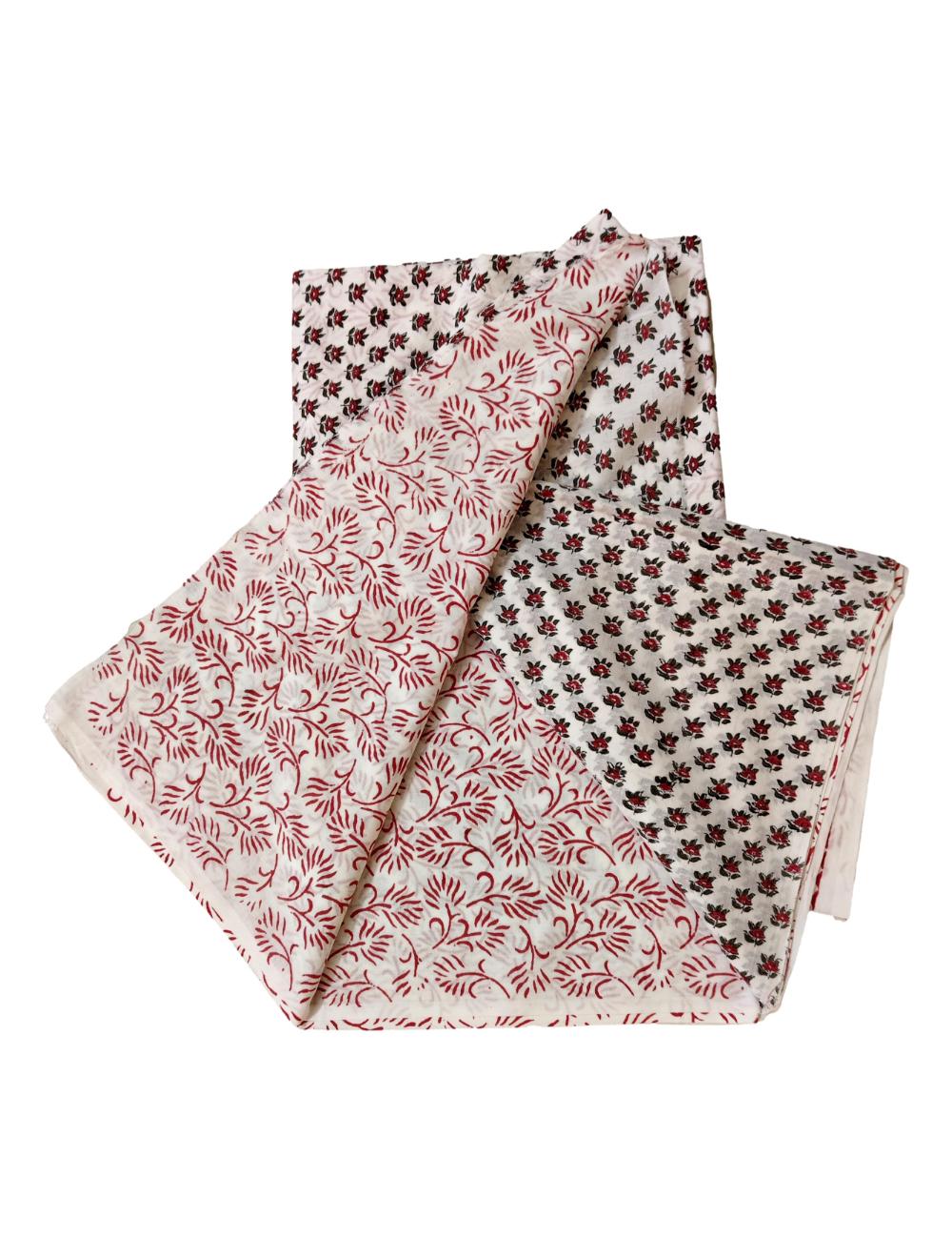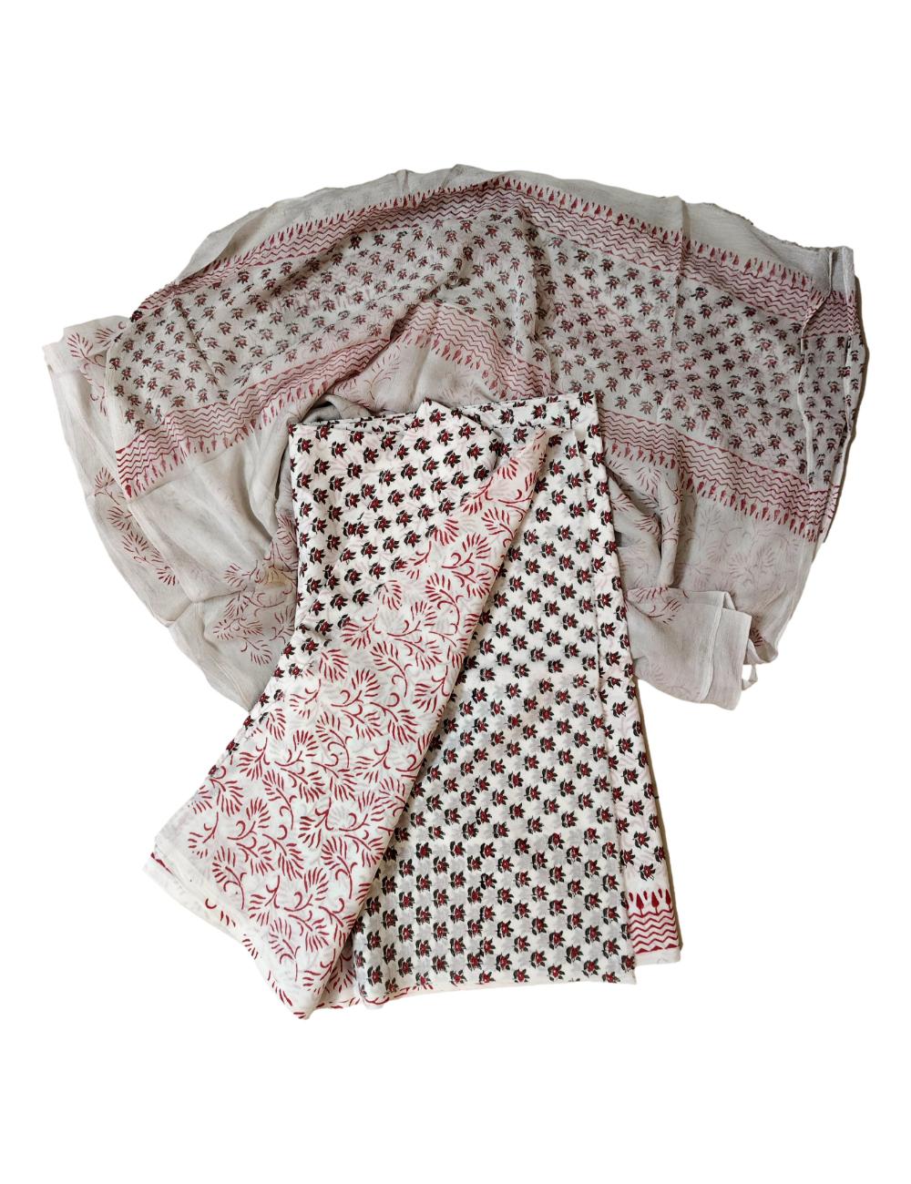 Pure Cotton hand block printed women’s dress material with pure chiffon dupatta – White and Red (Unstitched)