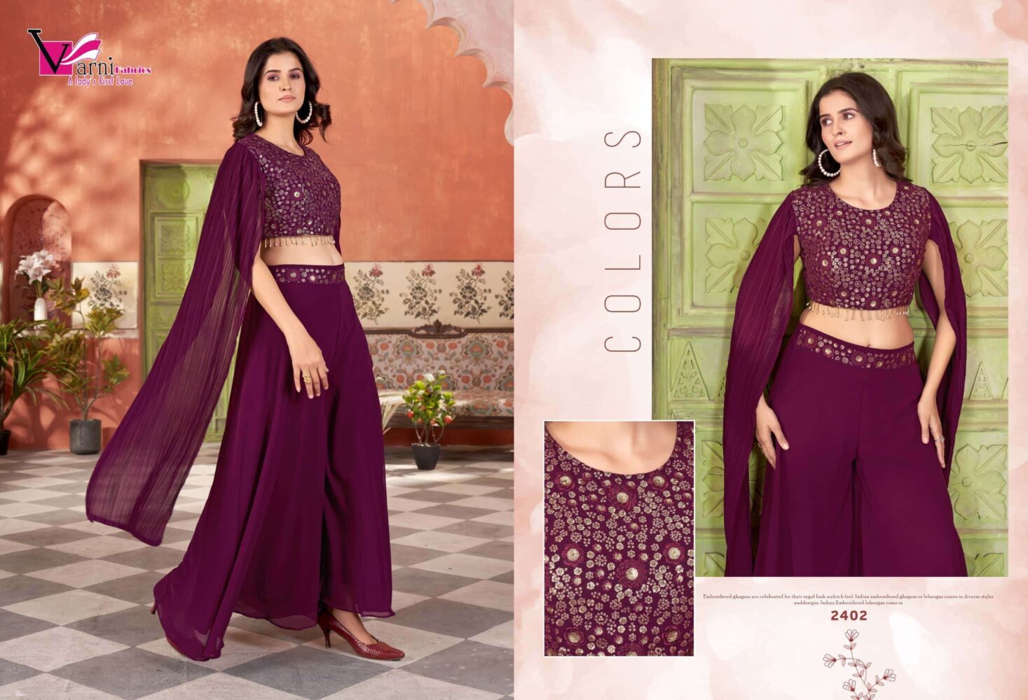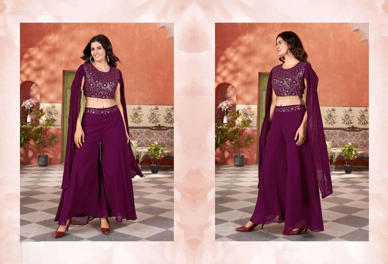 The Indo western palazzo style set by Surmayee showcases elegant embroidery on top and waist belt of palazzo on premium quality fabric with intricate detailing, and elegant craftsmanship.