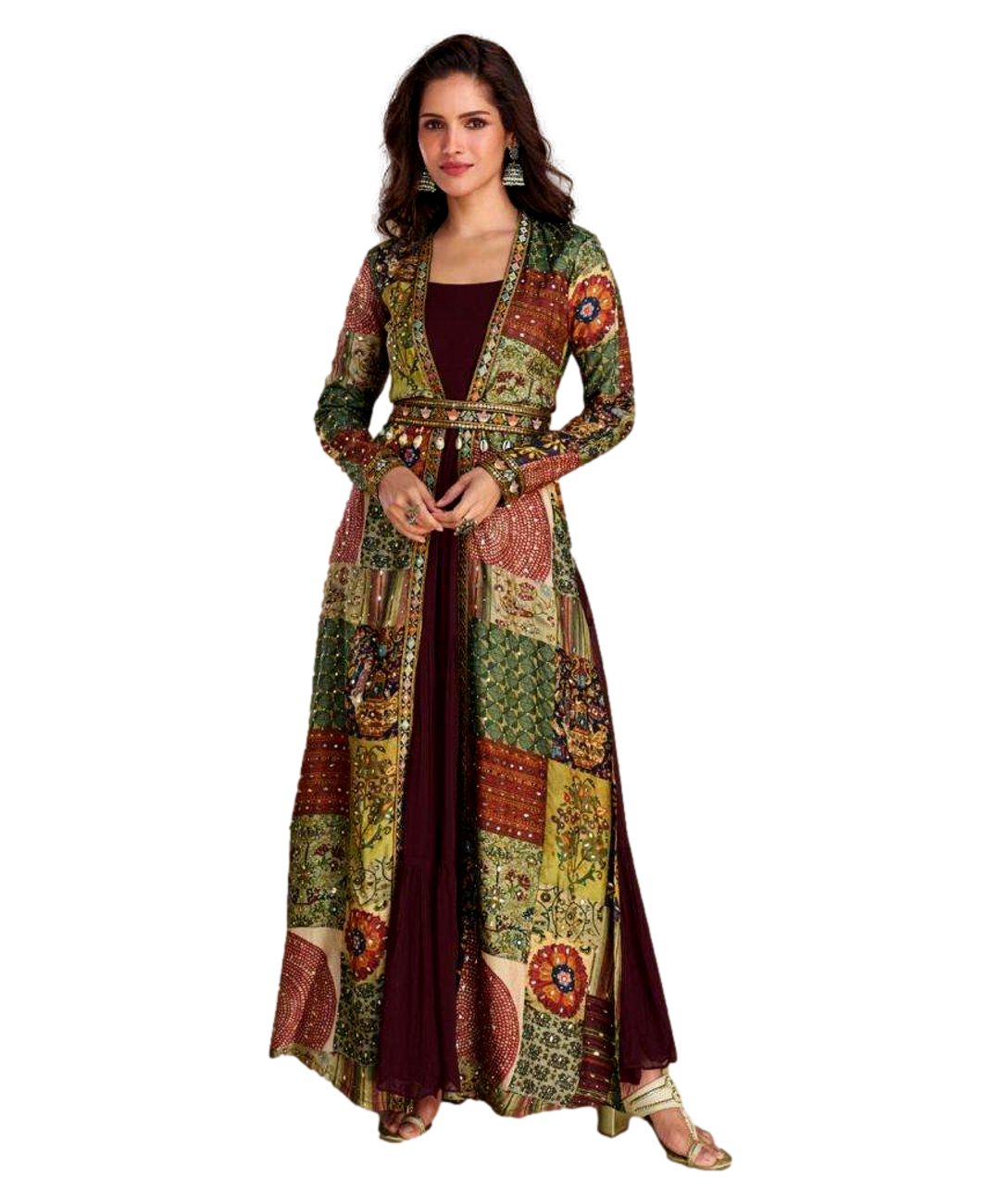 Surmayee Designer Readymade Indo Western Dress with Shrug-Brown