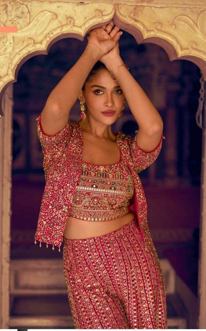 Step into pure elegance with Surmayee Designer  Sharara/Palazzo set with koti/shrug. A luxurious collection of readymade georgette suits crafted for timeless sophistication. Designed with a georgette top and bottom, this collection exudes a soft, flowy charm — perfect for festive occasions, weddings, and party wear styling.
