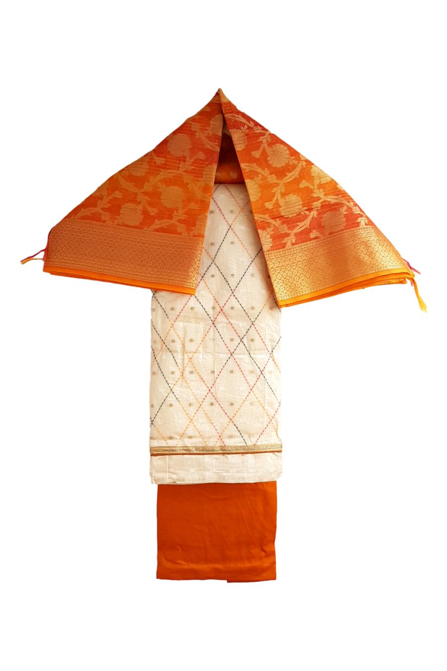 This beautiful unstitched dress material is made of elegant Chanderi material with traditional Chanderi Banarasi Dupatta. This is a must have collection to your wardrobe to adorn yourself during home parties, Family celebrations and Friends reunion.