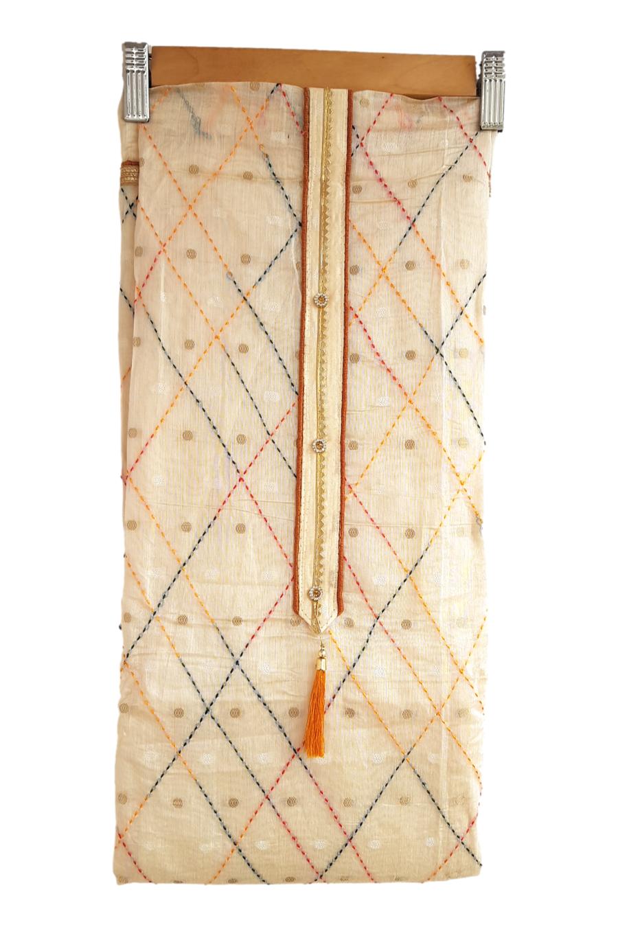 - Kurta (Unstitched) : FABRIC- Chanderi Cotton. Printed and Emroidered with Satin lining. Length 2.25 m