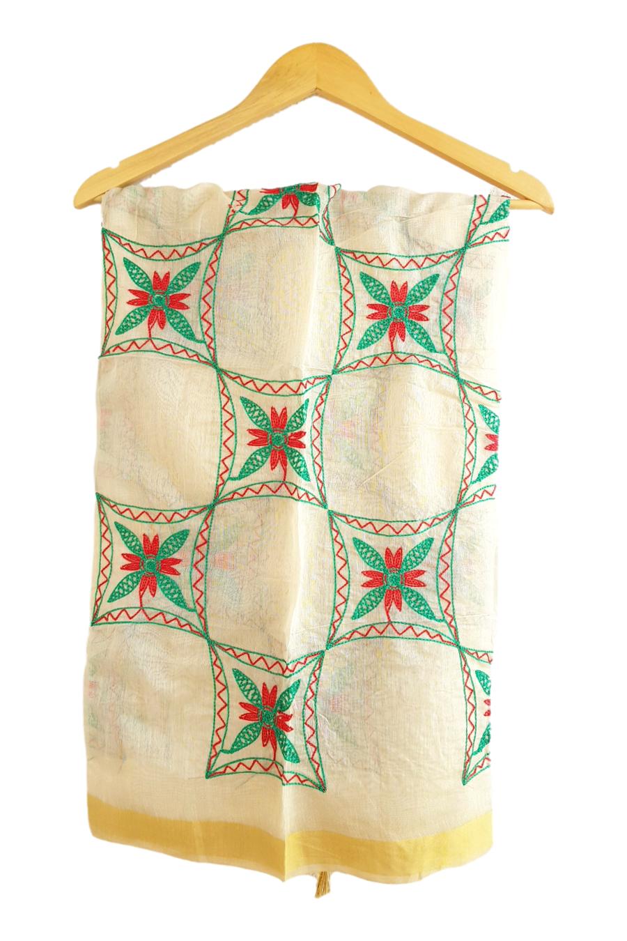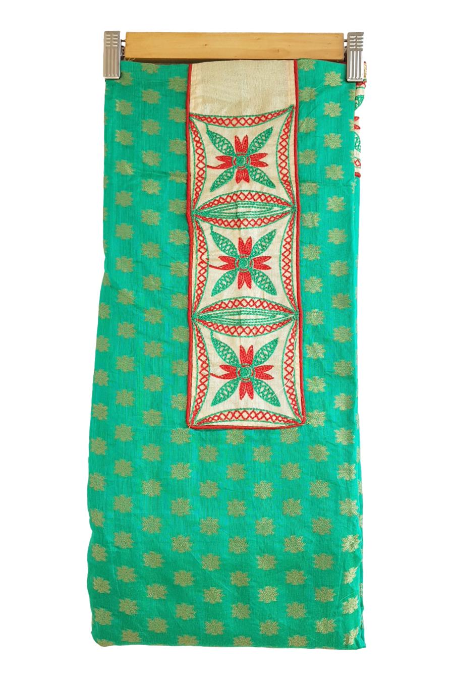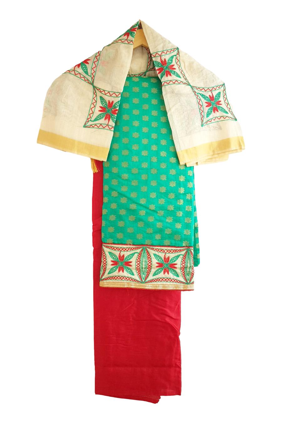 Unstitched Chanderi Dress material with embroidered chanderi dupatta – Green and Red