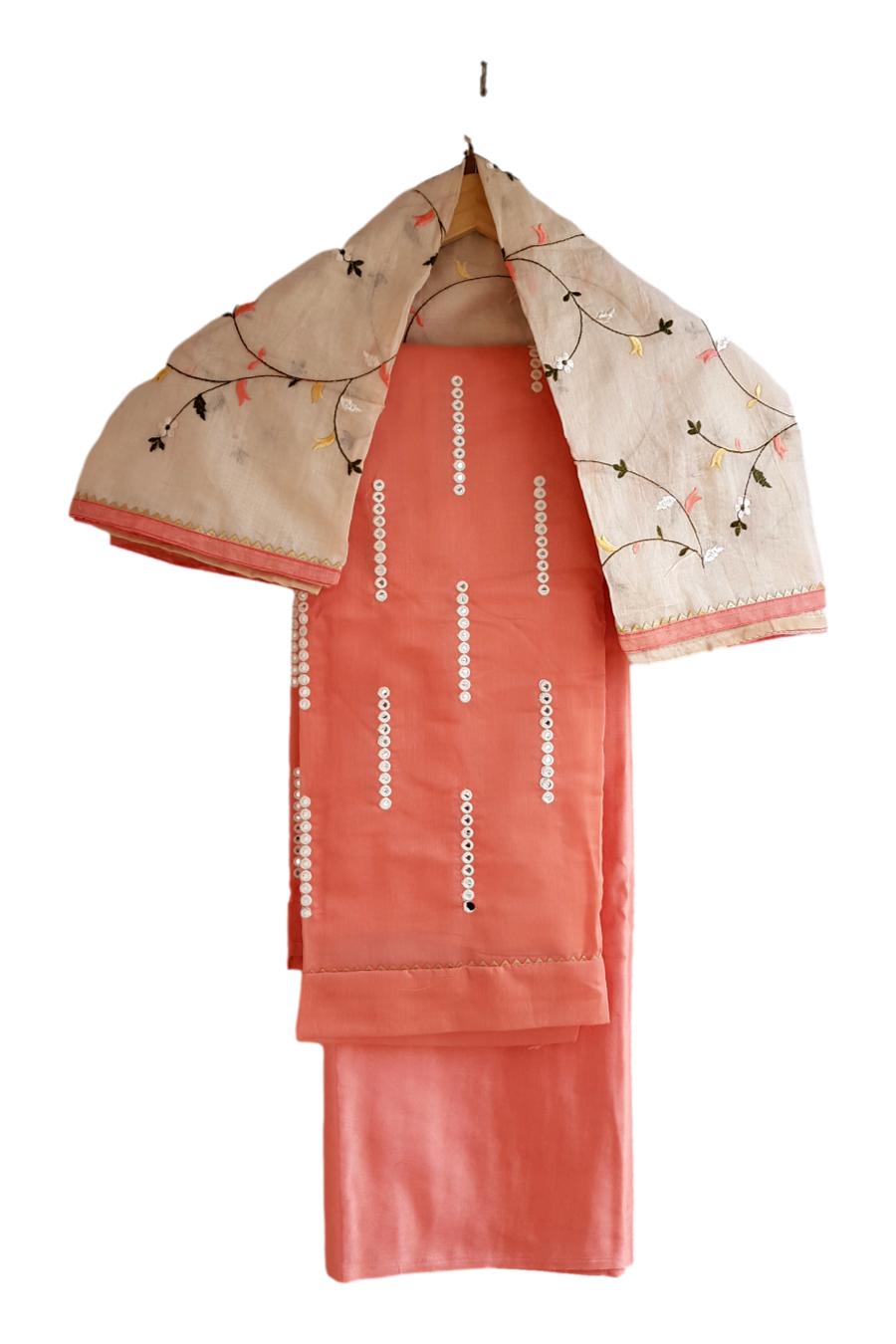 - Kurta (Unstitched) : FABRIC- Chanderi Cotton with foil mirror work and with Santoon lining. Length 2.25 m