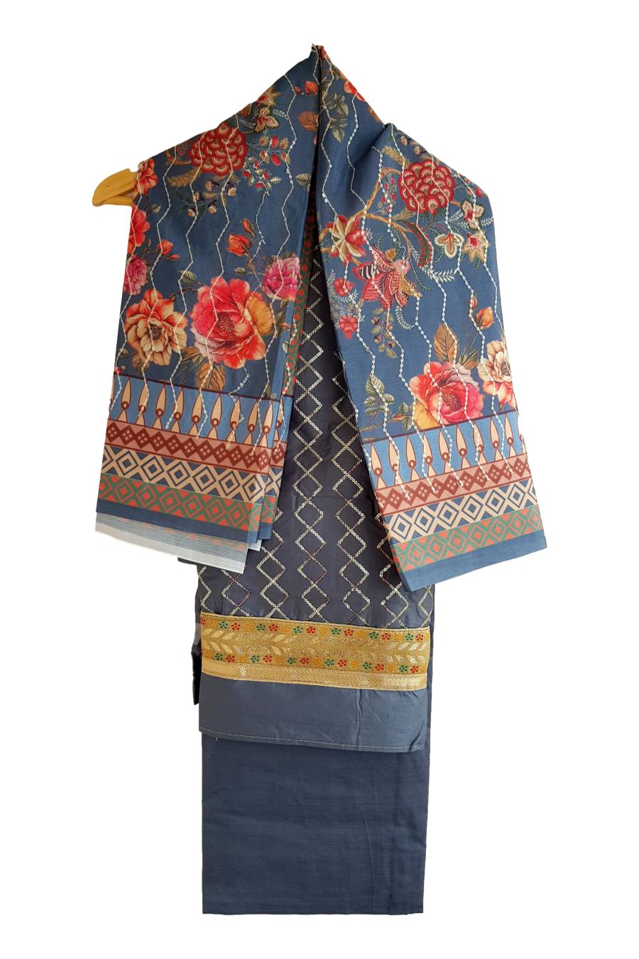 This beautiful unstitched dress material is made of elegant Jam cotton material with traditional Jam Silk Dupatta. This is a must have collection to your wardrobe to adorn yourself during home parties, Family celebrations and Friends reunion.