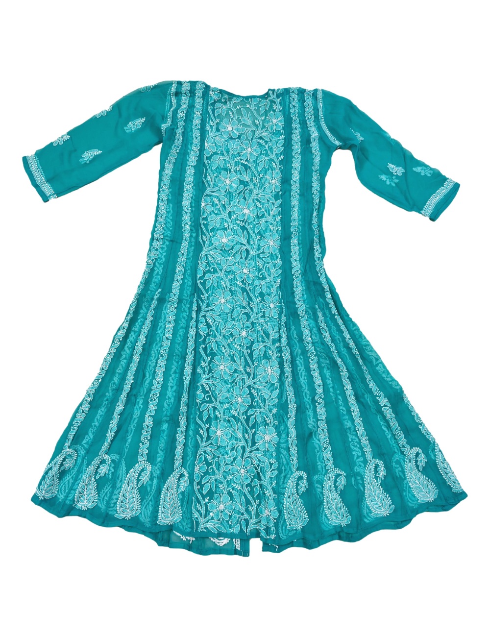 The kurta features a A-line silhouette that flatters every body type, highlighted by intricate Chikankari embroidery that adds a touch of elegance and grace. Designed with a classic round neckline and full sleeves, it provides a versatile look suitable for various occasions.