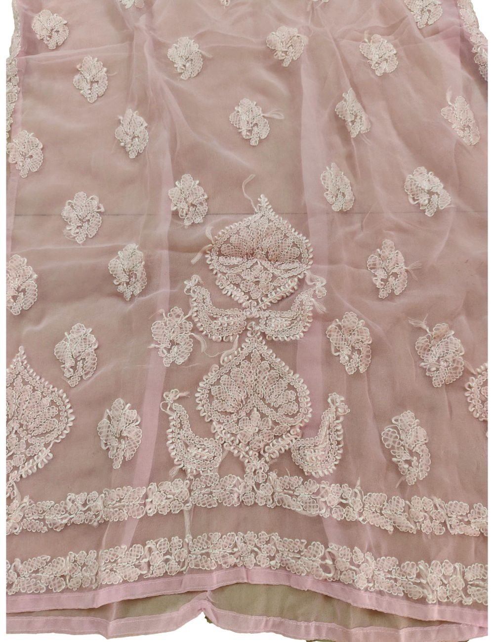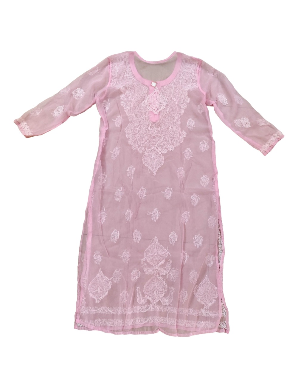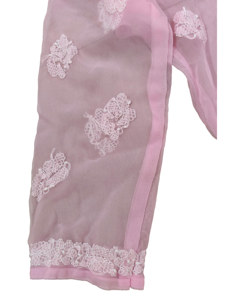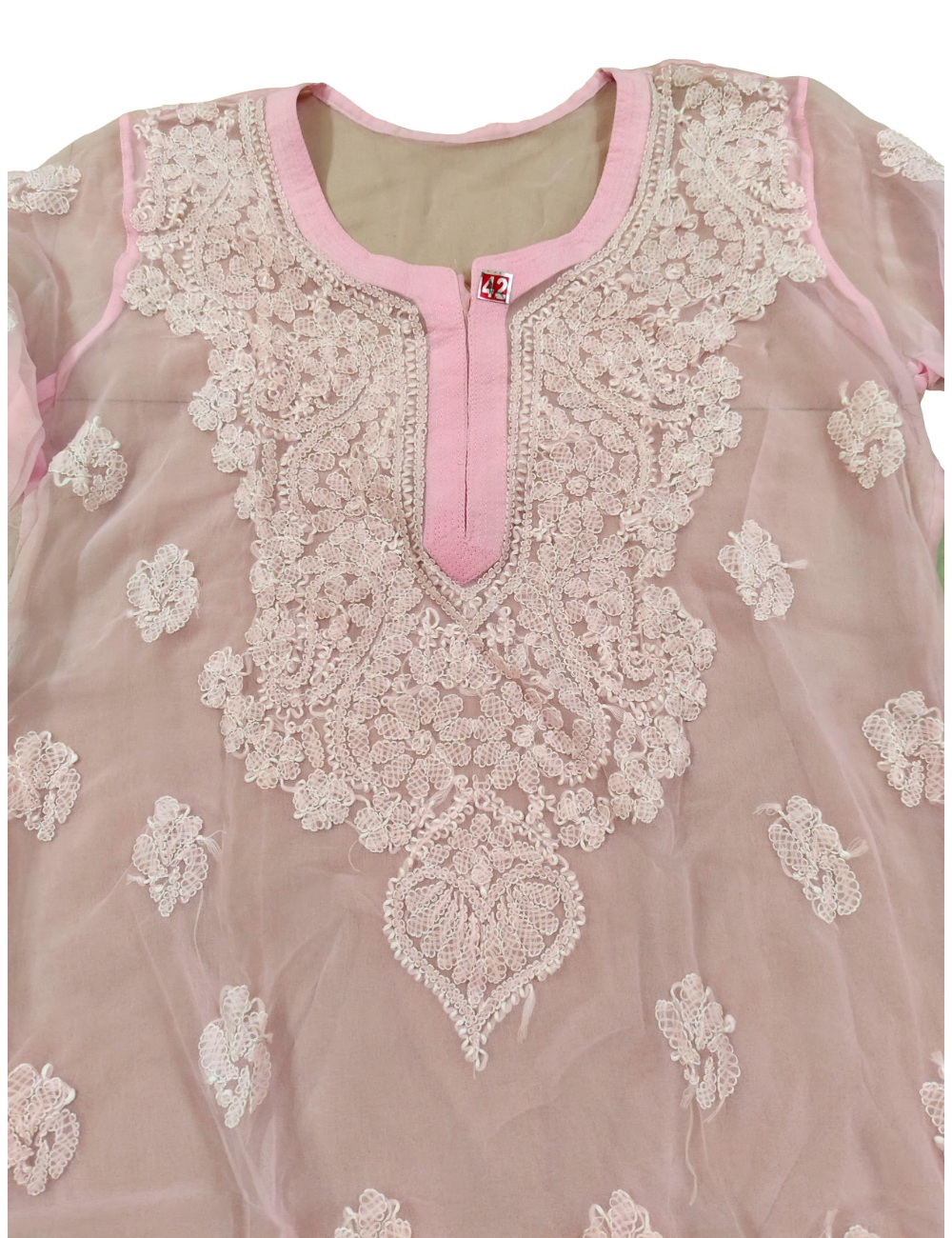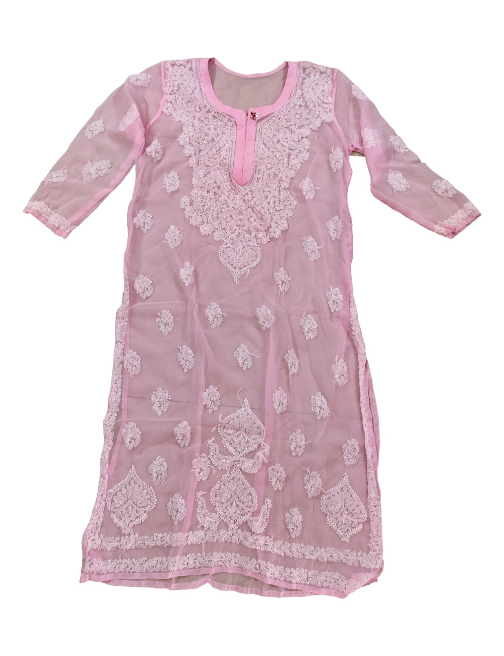 - Kurta Fabric: Chiffon|| Kurta Color: Pink with white embroidery