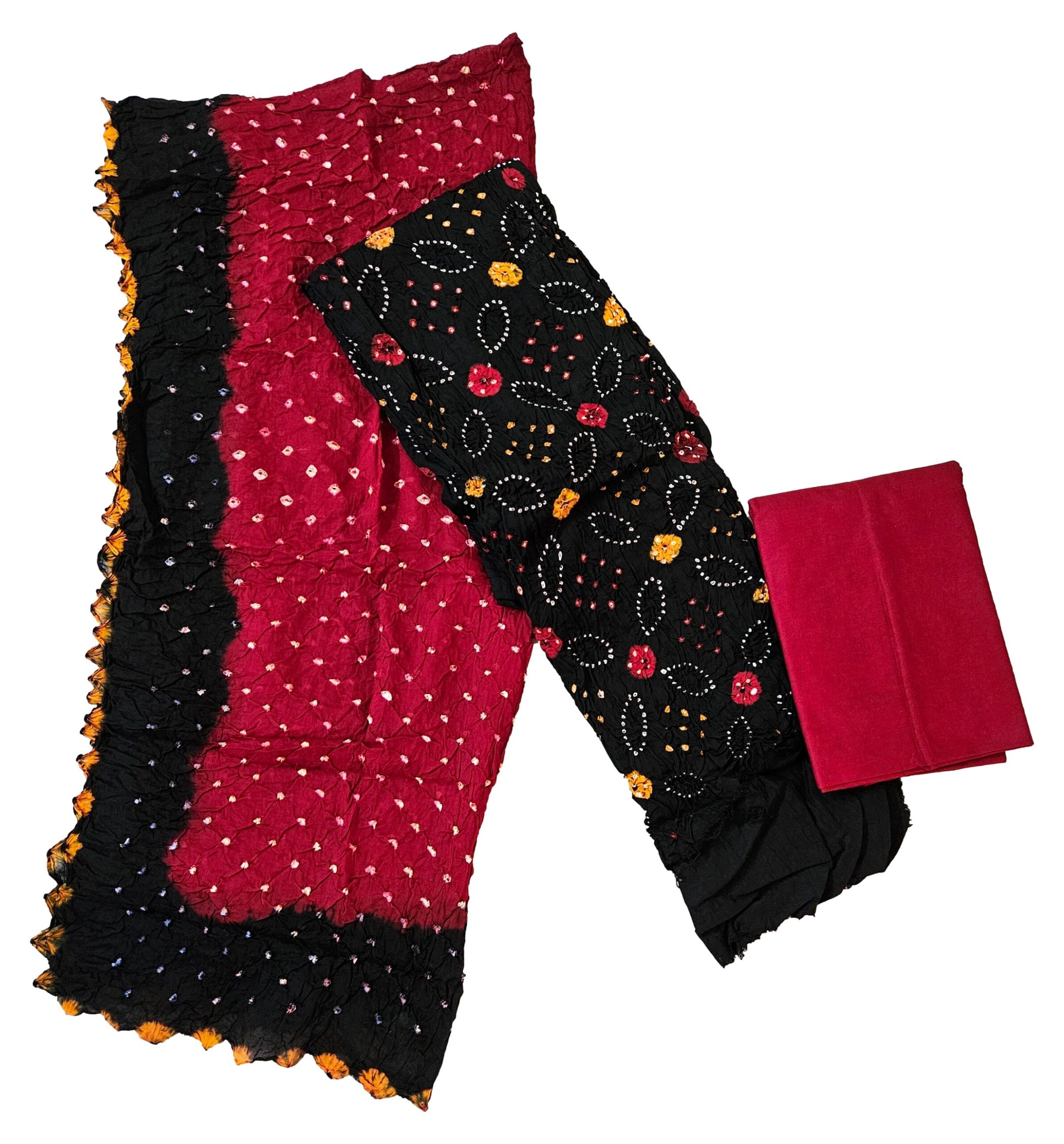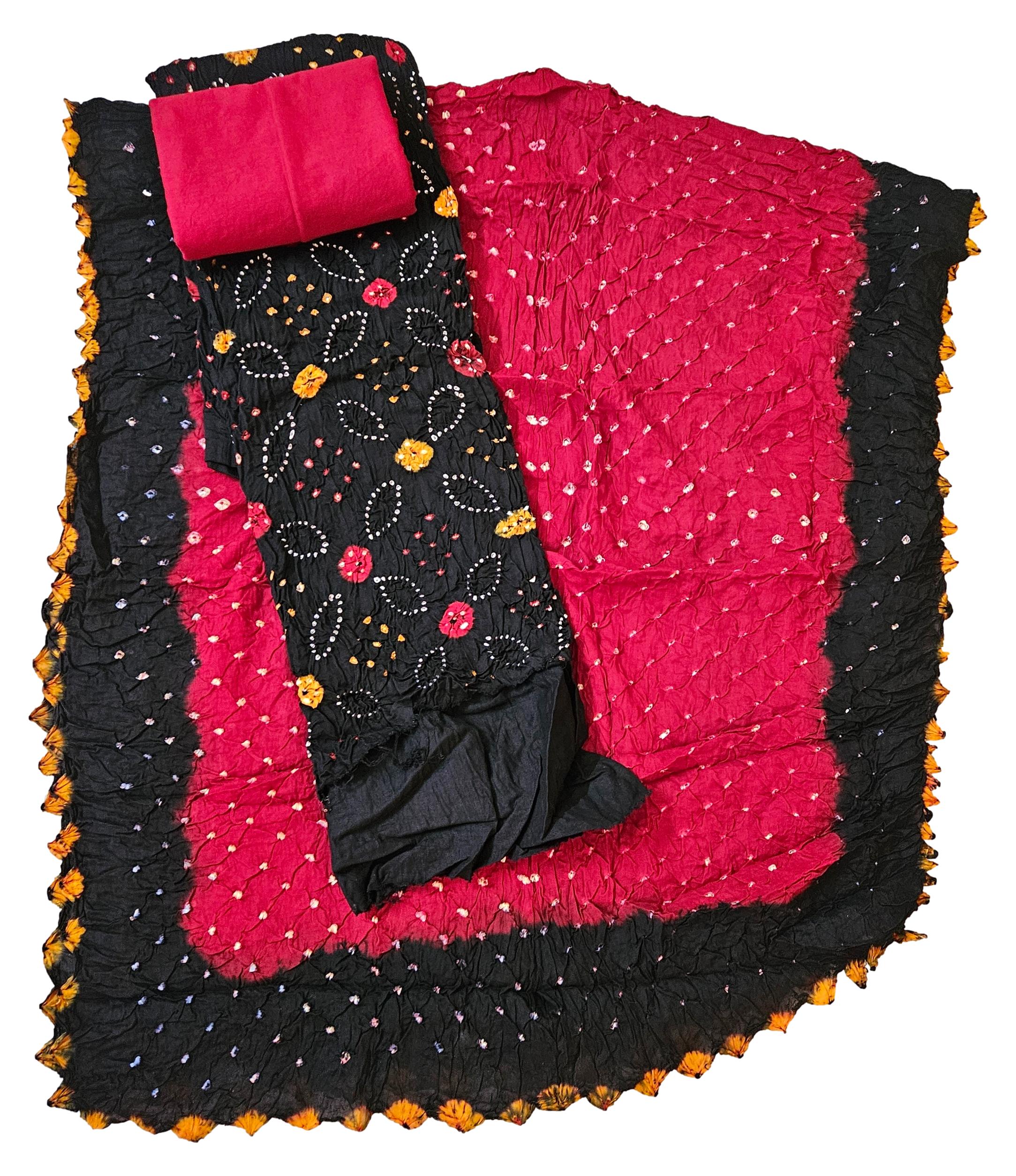 Women’s Pure Cotton Rajasthani Bandhani unstitched dress material with dupatta (Black and Maroon)