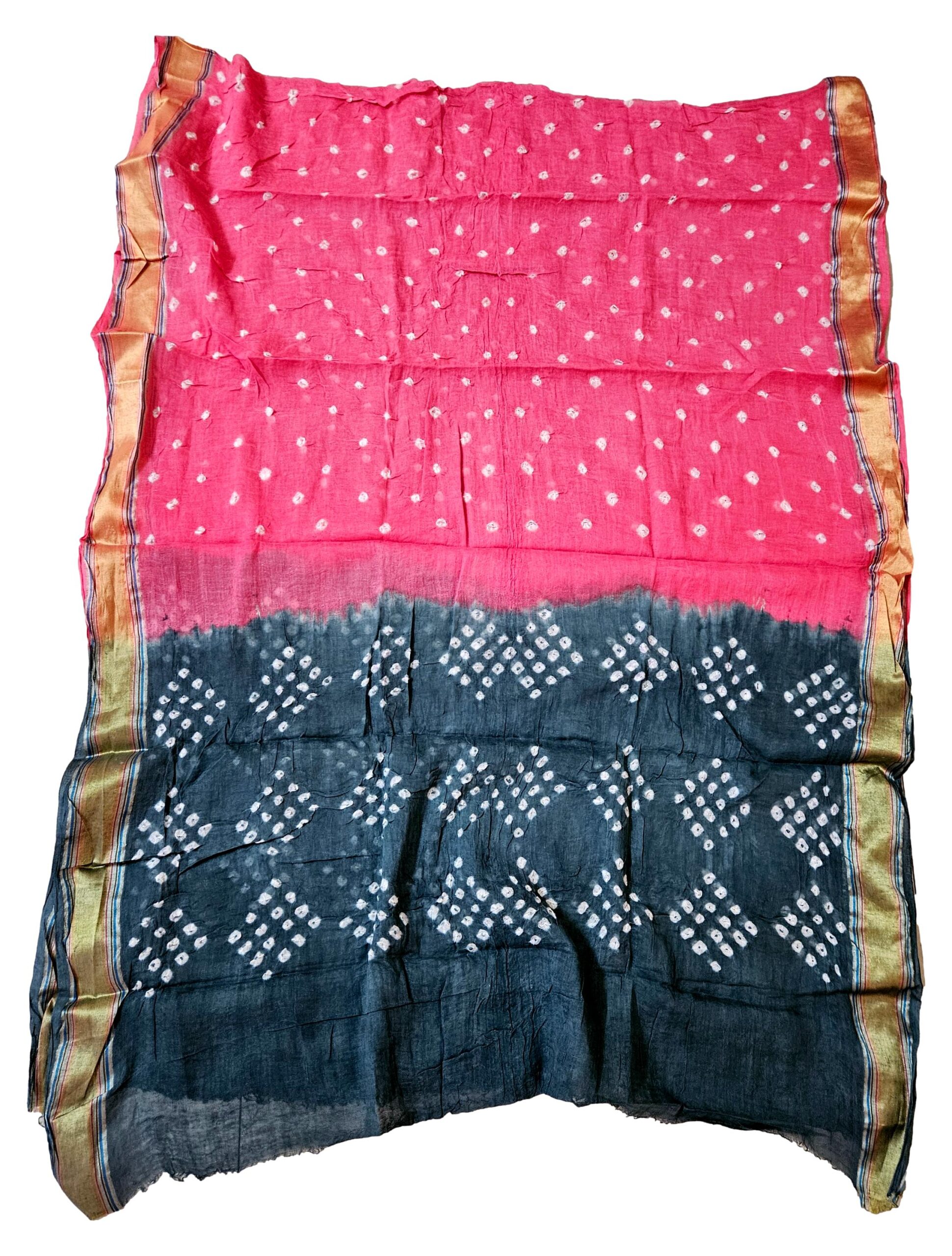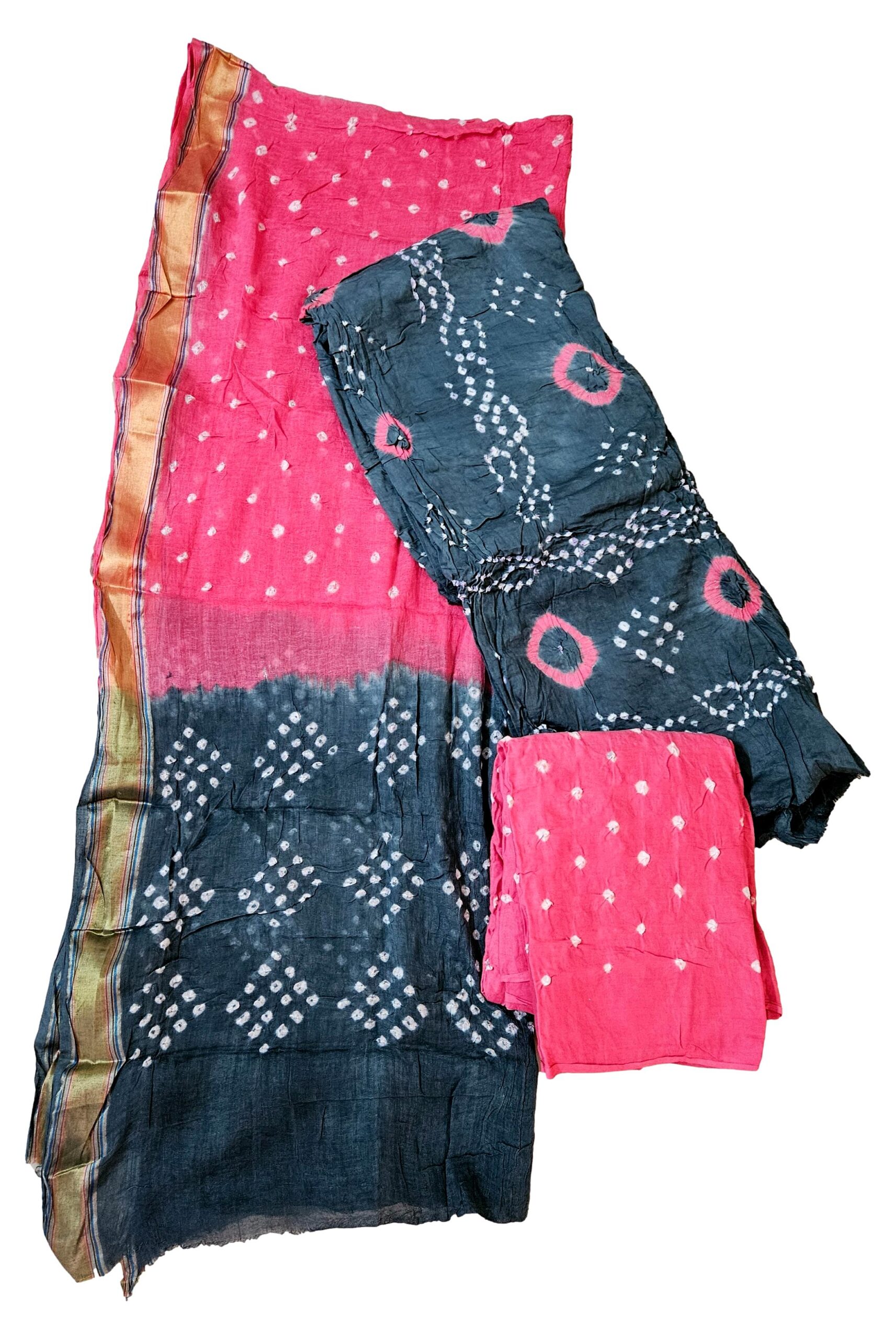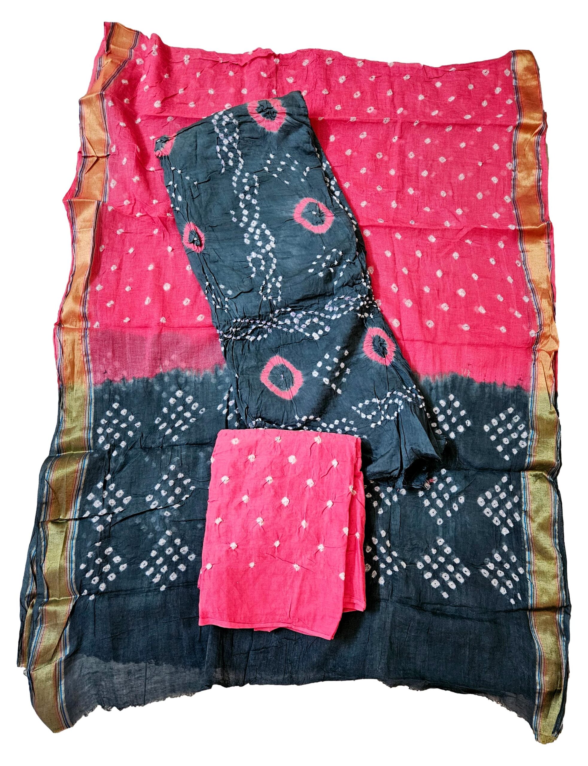Women’s Pure Cotton Rajasthani Bandhani unstitched dress material with dupatta (Grey and Pink)