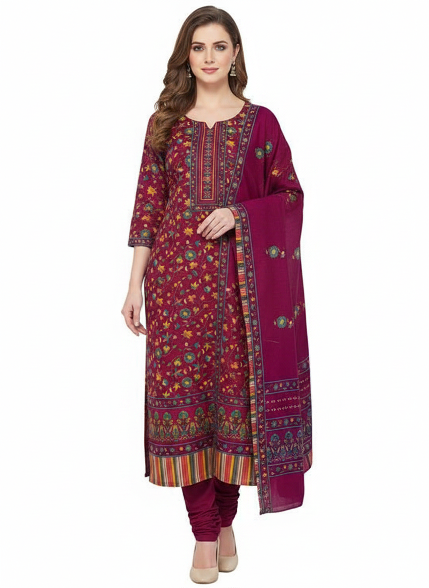 Drape yourself in elegance with this 3pc woolen pashmina dress material. The set includes a beautiful kurta, salwar and a matching dupatta fabric.